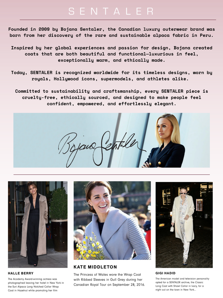 Founded in 2009 by Bojana Sentaler, the Canadian luxury outerwear brand was born from her discovery of the rare and sustainable alpaca fabric in Peru. Inspired by her global experiences and passion for design, Bojana created coats that are both beautiful and functional-luxurious in feel. Today, SENTALER is recognized worldwide for its timeless designs, worn by royals, Hollywood icons, supermodels, and athletes alike. Committed to sustainability and craftsmanship, every SENTALER piece is cruelty-free, ethically sourced, and designed to make people feel confident, empowered, and effortlessly elegant.