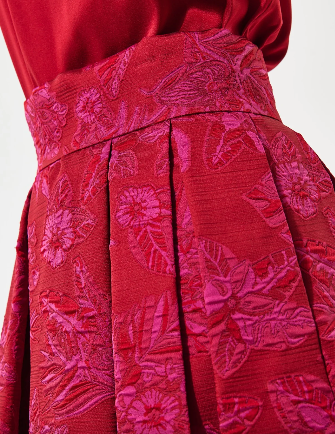 This full, mid-calf skirt is crafted taffeta- deep box pleats gather into a wide waistband, creating graceful volume and movement. Perfect for evening, pair it with a simple shirt or fine knit for effortless elegance.