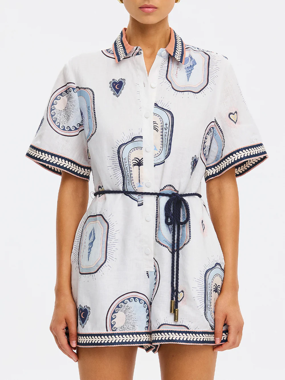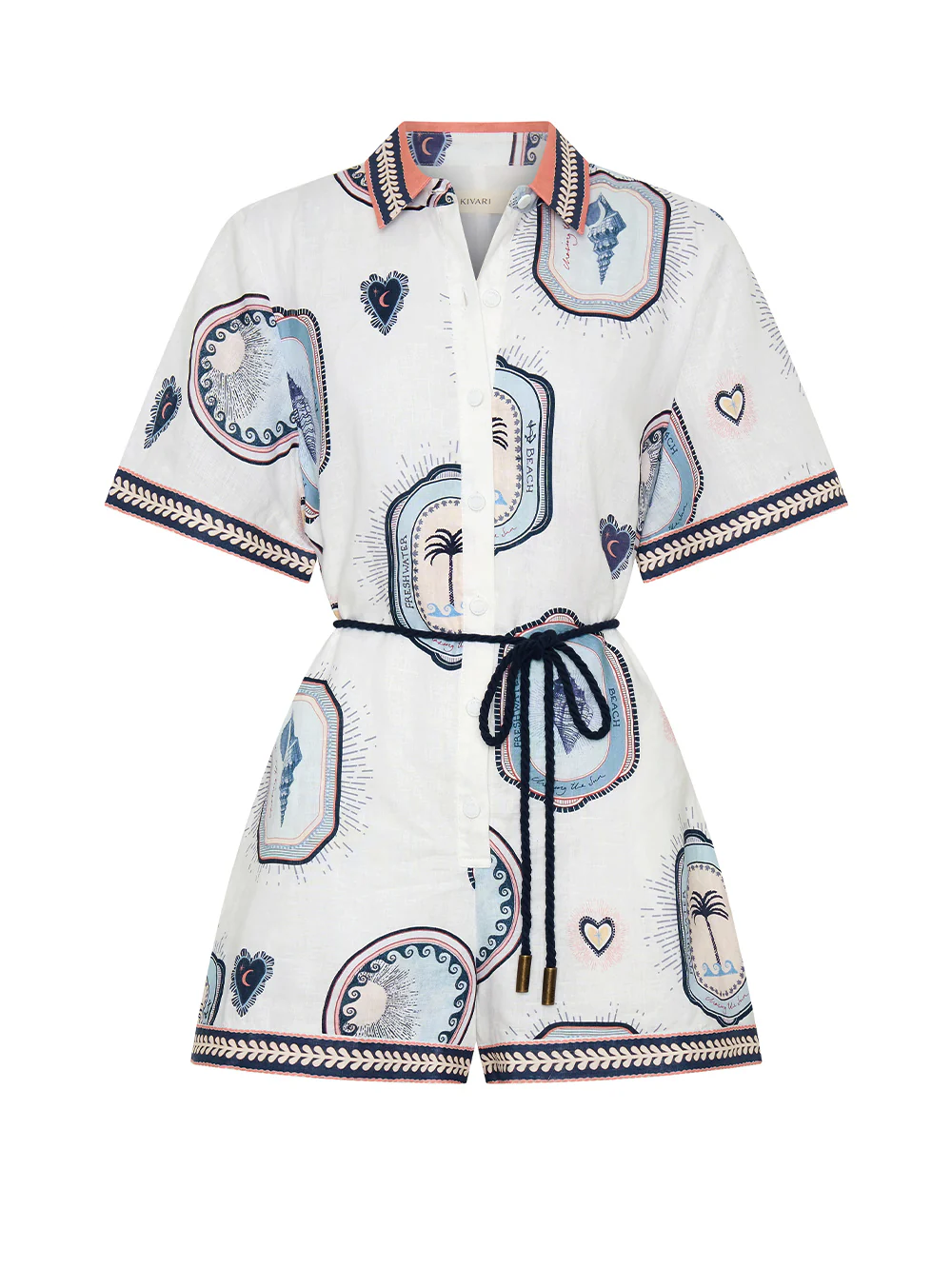 Relaxed linen playsuit in cream and navy with vintage-inspired coastal motifs for effortless seaside style. Features a collared bodice and adjustable rope tie for a flattering waist definition. Wear with sandals for daytime or heels for evening gatherings.