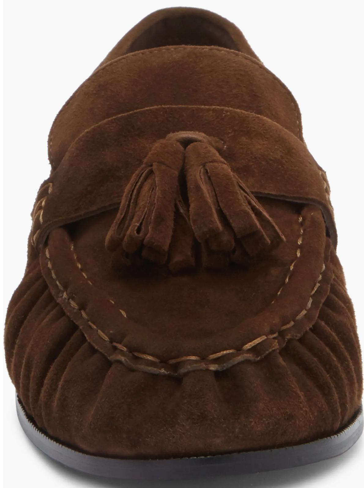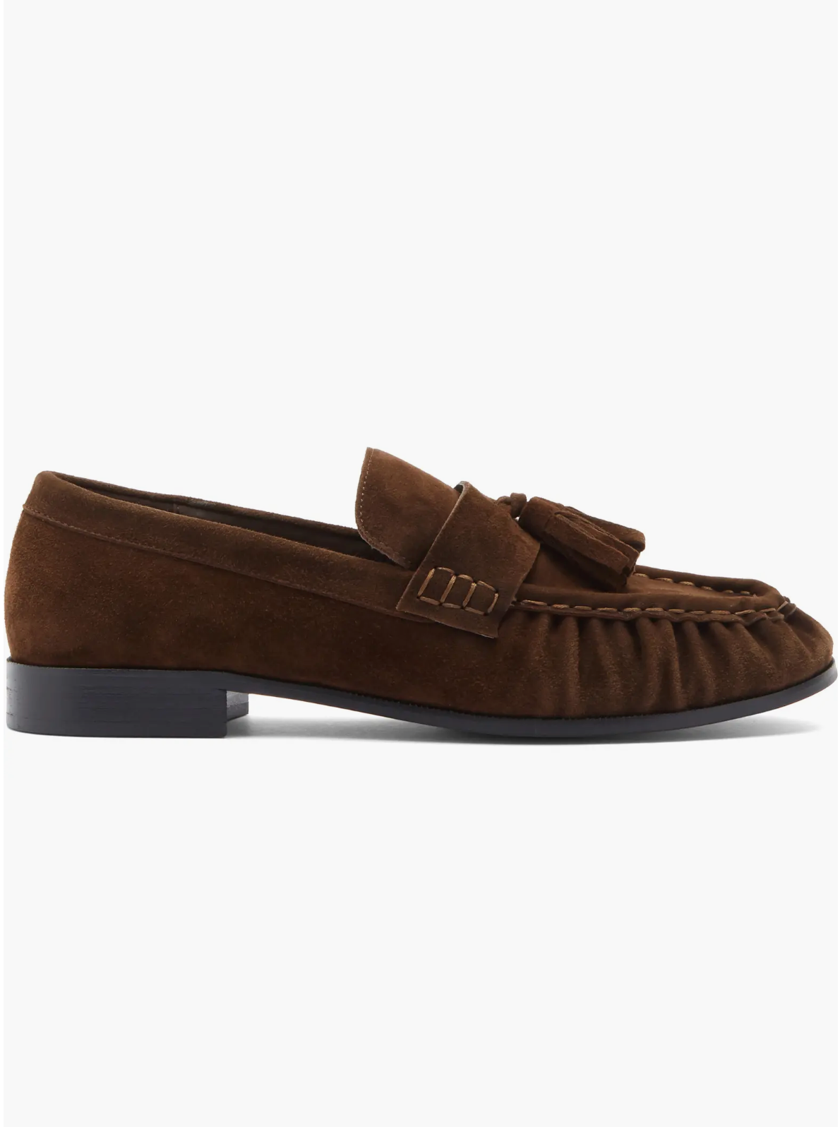 This suede tassel loafer is a timeless expression of polished ease. Crafted in supple brown suede with a textured apron toe, it brings refined sophistication to everyday footwear, while the tassel detailing adds a nod to classic menswear styling. The low stacked heel offers just enough lift for all-day wear, making it perfect for pairing with tailored trousers, cropped denim, or fluid midi skirts. An effortlessly elegant shoe that transitions seamlessly from workdays to weekends with understated confidence.