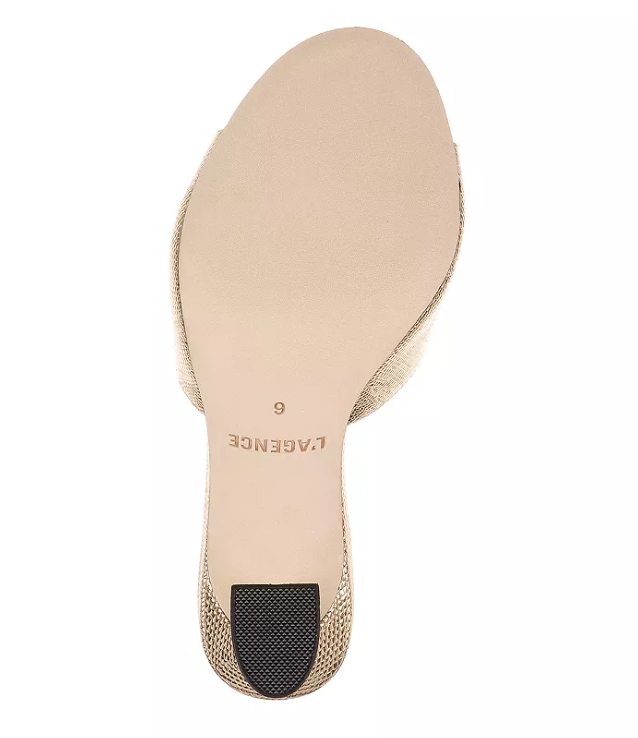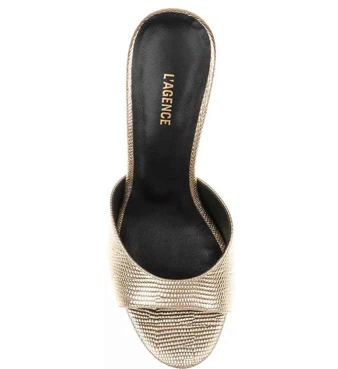 The Avery backless sandal effortlessly combines classic style with a modern twist. Featuring a subtly flared heel, this sandal transforms a chic silhouette into an elegant statement piece. The luxurious gold lizard finish adds a touch of glamour, while the rounded-toe sole and clean vamp design keep the look timeless and versatile.