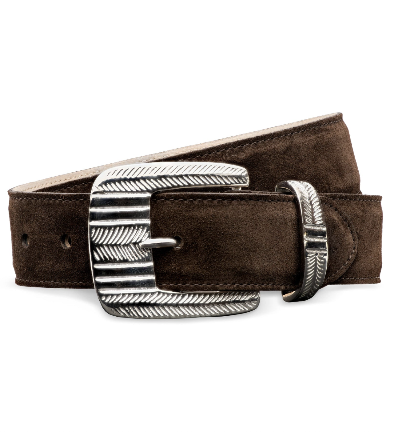 Crafted in collaboration with Streets Ahead, this chocolate brown belt embodies timeless craftsmanship and subtle Western charm. Made from 100% Italian suede, it features a silver-plated brass buckle with delicate engraved detailing that adds texture and sophistication. Handcrafted in Los Angeles, this versatile accessory pairs effortlessly with denim or dresses for a polished, everyday finish.