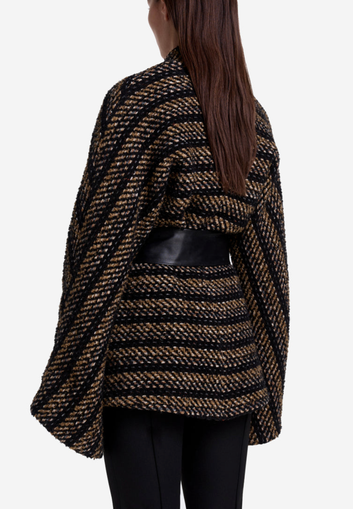 One jacket, endless possibilities. This collarless wrap jacket is designed with versatile styling in mind—wear it tied tight for a defined silhouette, draped open for effortless ease, or belted in the back for subtle structure. A relaxed fit and exaggerated sleeves deliver polished comfort, while the wide leather sash adds a luxe finishing touch. From weekday office layers to weekend dinner plans, this piece adapts beautifully to every moment.
