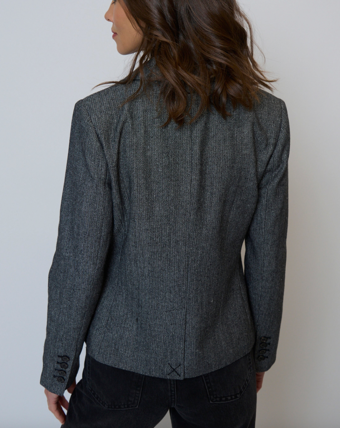 Cut in a tailored fit, this jacket delivers a clean, sharp silhouette with just the right amount of structure. The refined herringbone texture and softly padded shoulders create a polished shape that feels both timeless and modern. A versatile layering piece, it transitions seamlessly from desk to dinner, pairing effortlessly with everything from crisp trousers to off-duty denim.