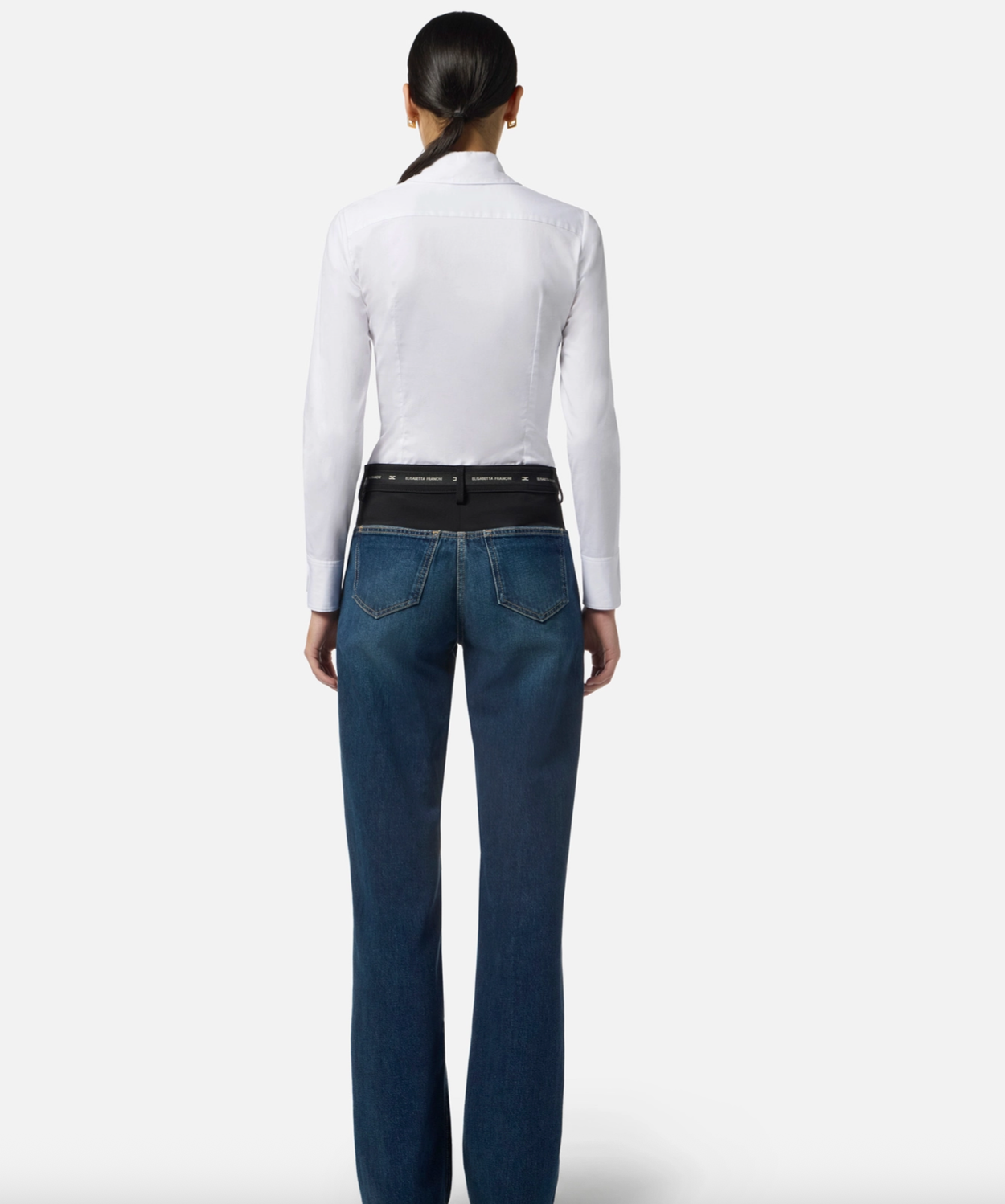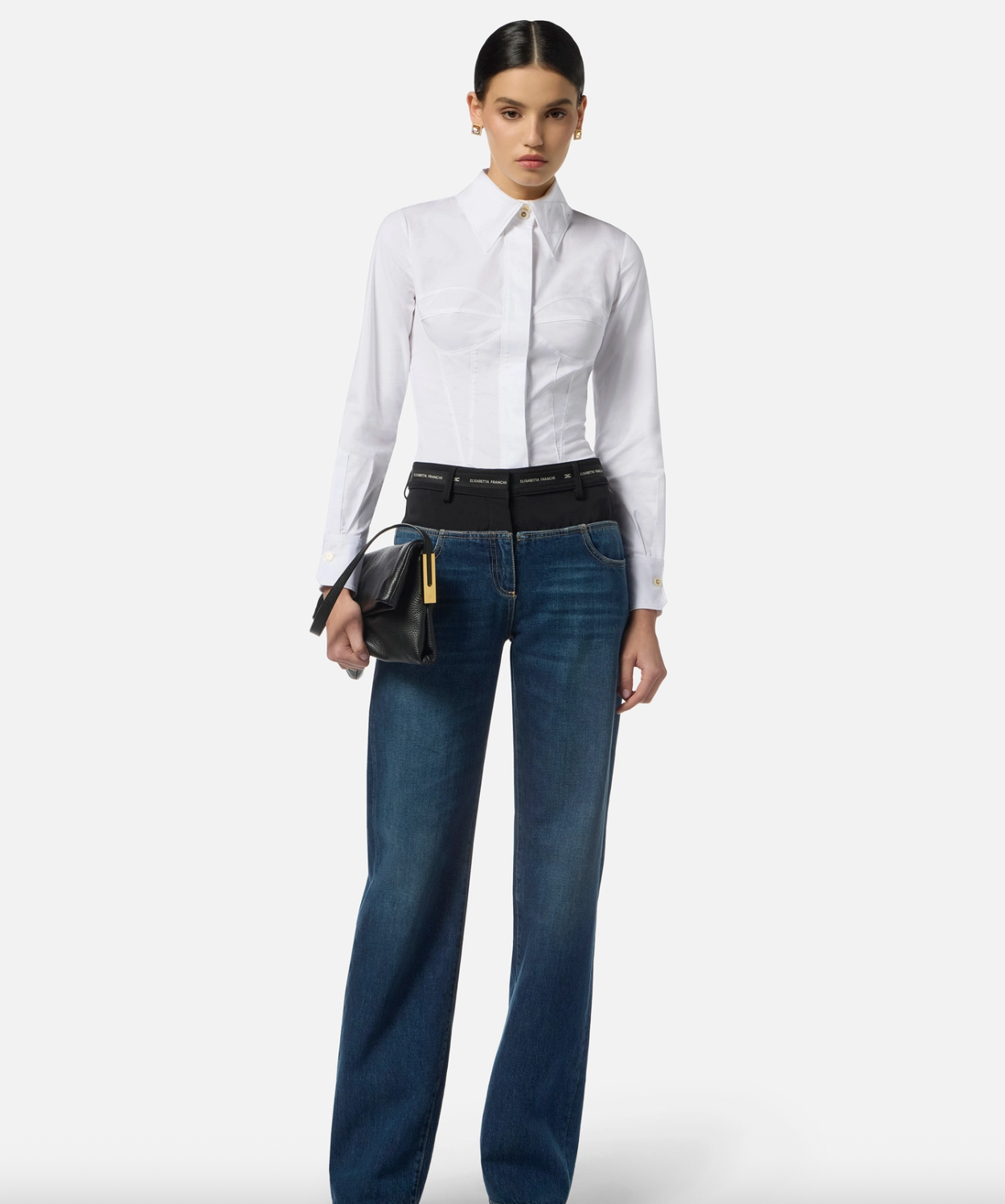 This slim-fit shirt in soft cotton poplin is elevated with tailored bustier-inspired seaming at the front for a flattering, structured effect. A pointed collar embroidered with a matching logo adds a subtle signature touch, while wide sleeve slits bring a modern, feminine finish.