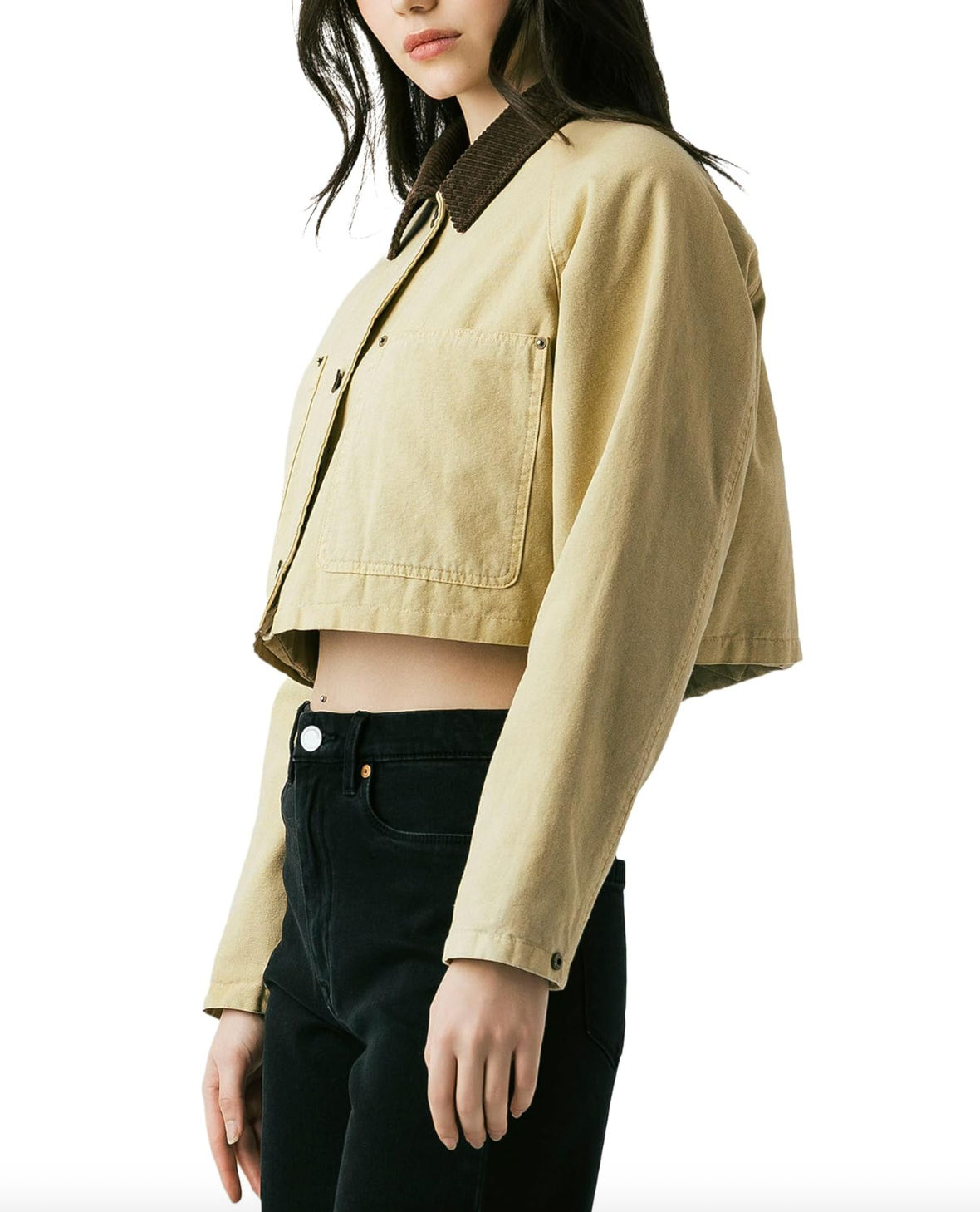 With a structured yet laid-back silhouette, the Breaking Camp Cropped Twill Jacket delivers effortless cool in every stitch. Designed with a classic collared neckline accented by corduroy detailing for a subtle vintage twist, this jacket balances timeless style with modern ease. Long sleeves, a button-front closure, and front patch pockets add functional utility, making it the perfect layer over everyday basics or your favorite denim.