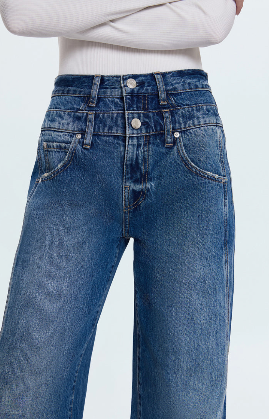 Meet the signature jean that redefines your wardrobe. Caleb sits as a high rise with a wide leg silhouette designed to elevate everyday styling with bold, architectural structure. The double-stacked waistband and sleek side seams add refined interest while the full-length inseam delivers runway-level proportions. Crafted in rigid denim in our Echo wash — a pure, medium blue tone with crisp finishes — this pair brings intentional sophistication to any look.