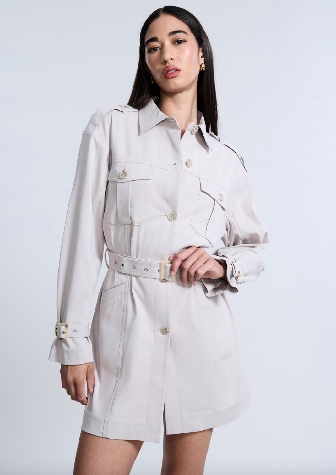 The Cargo style coat inspired dress combines a sleek, tailored fit with utilitarian-inspired details. The pointed collar, flap pockets, and belted waist create a flattering silhouette, while the long sleeves and adjustable cuffs add to the dress's versatility. Perfect for both casual outings and more polished events, this dress is an essential piece for your wardrobe.