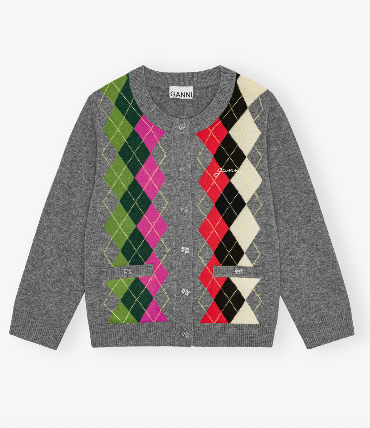Crafted from a luxurious merino wool and cashmere blend, this slim-fit cardigan combines softness with vibrant style. The multicolor check pattern is accented by silver-tone button closures, two front pockets, and ribbed edges for a polished finish. Complete with an embroidered GANNI logo, it’s a playful yet refined layer for any season.