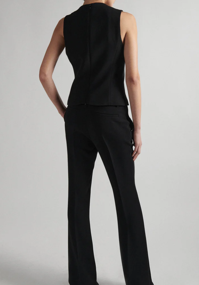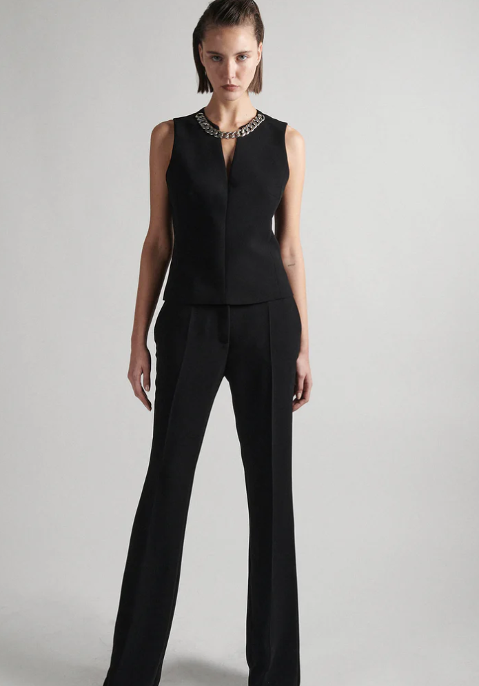 An exquisite sleeveless top, featuring a jewel neckline that exudes effortless sophistication. The brushed-finish matte silver metal bib necklace adds a touch of modern glamour, perfectly complementing the V-neckline extended by subtle, elegant stitching. Crafted from impeccable crepe, this top offers a sleek, shapely silhouette that pairs beautifully with high-waisted black trousers, creating a refined alternative to a traditional trouser suit. The discreet back zip at the collar and hem ensures a customizable fit, allowing you to adjust the neckline to your preference. Whether for a chic day at the office or an evening out, this top seamlessly blends elegance with versatility, making it a must-have addition to your wardrobe.