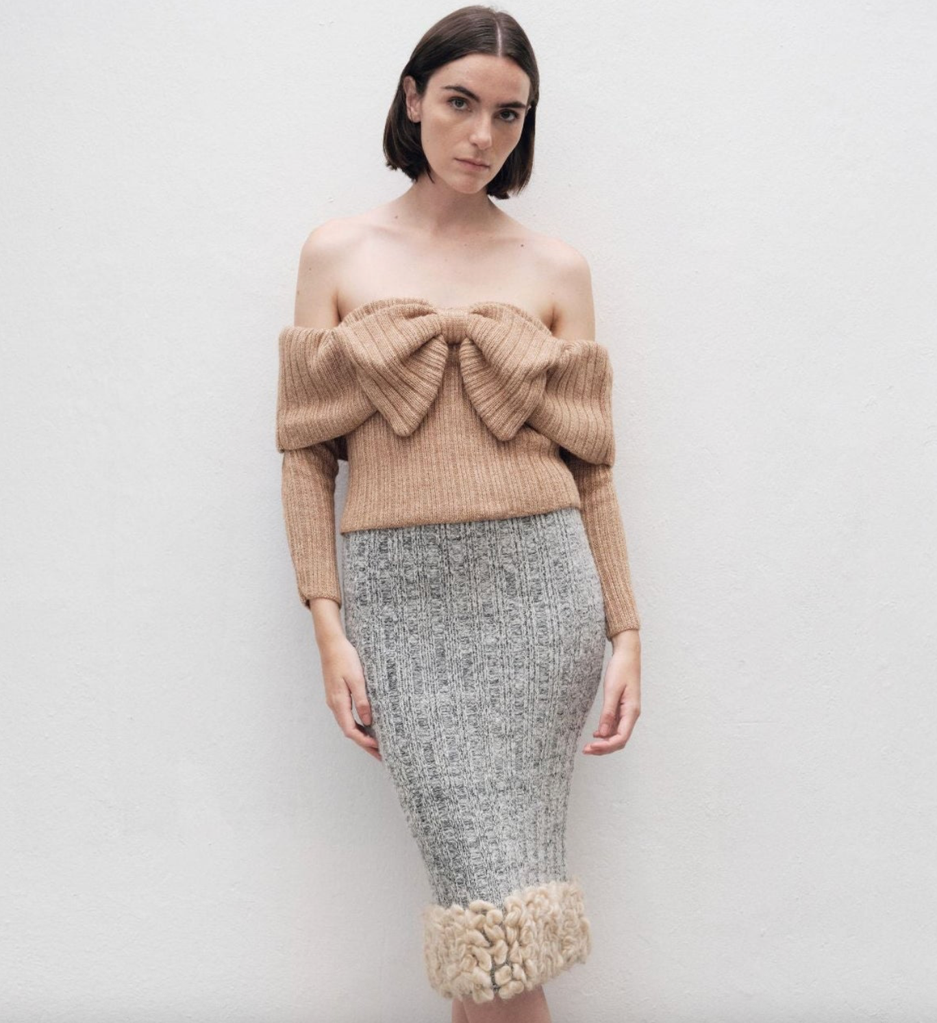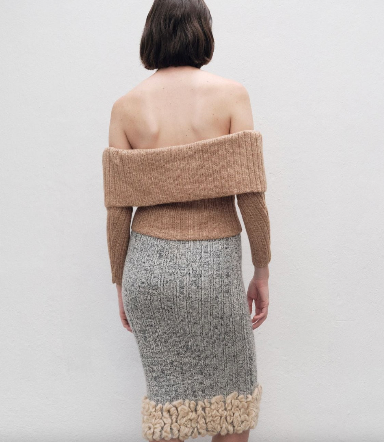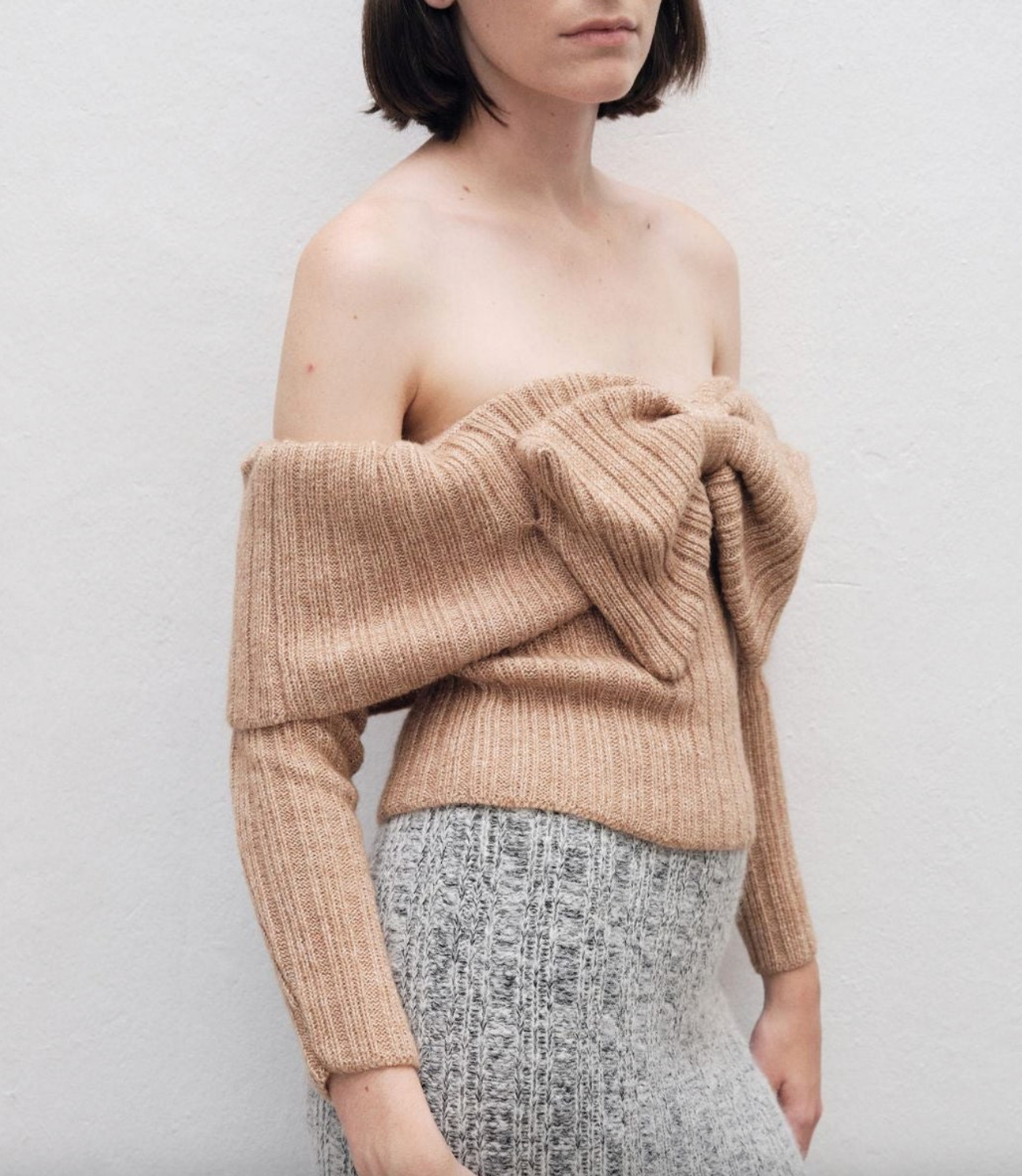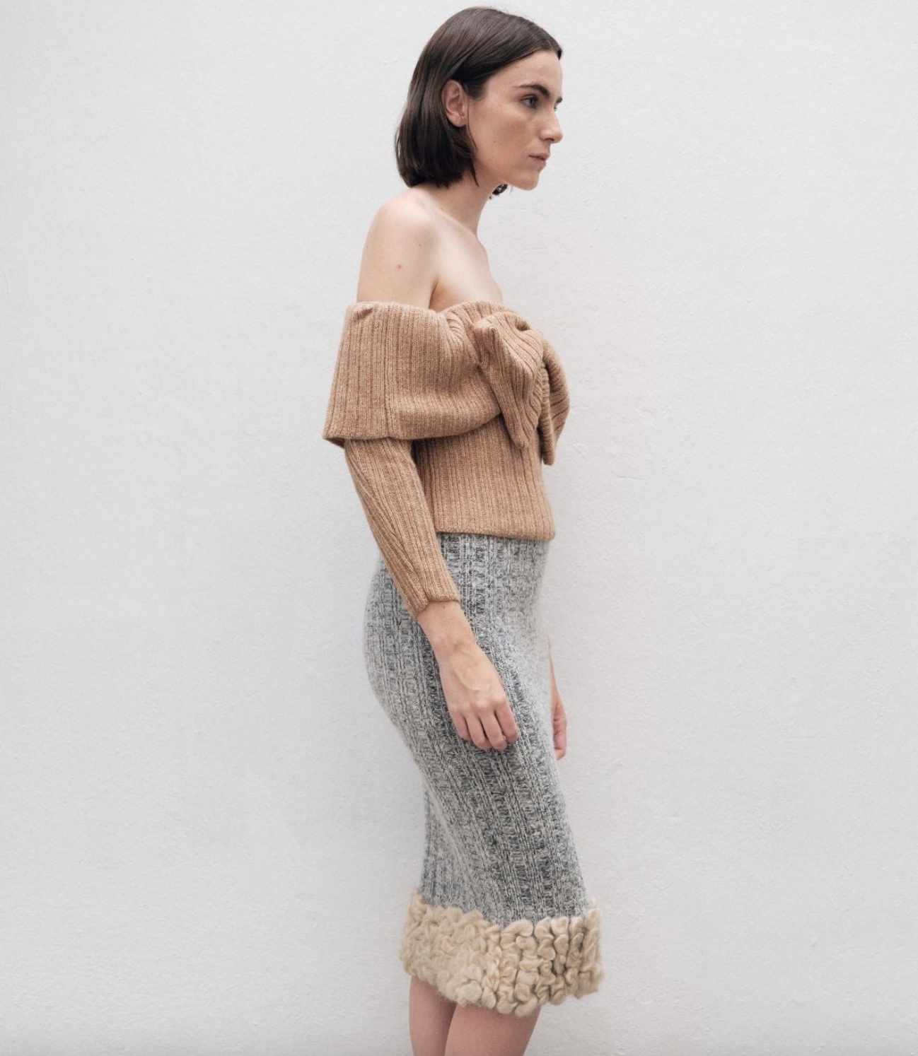 Feminine and undeniably chic, this off-the-shoulder sweater features a wide rib knit design and a statement maxi bow detail for a touch of modern romance. Crafted from a luxurious blend of baby alpaca, tanguis cotton, viscose, polyamide, and merino wool, it offers a soft, cozy feel with subtle stretch and structure. The elastic band ensures a comfortable, secure fit while highlighting the neckline beautifully.
