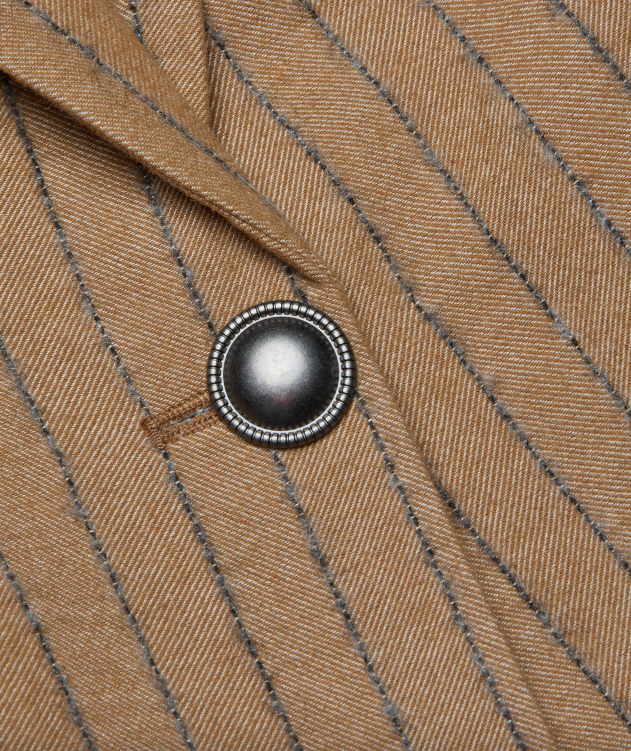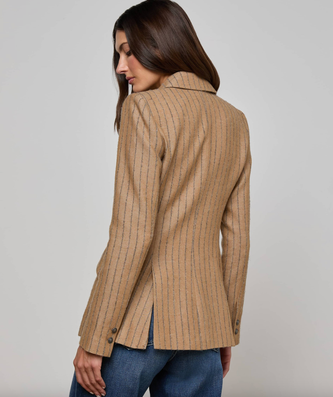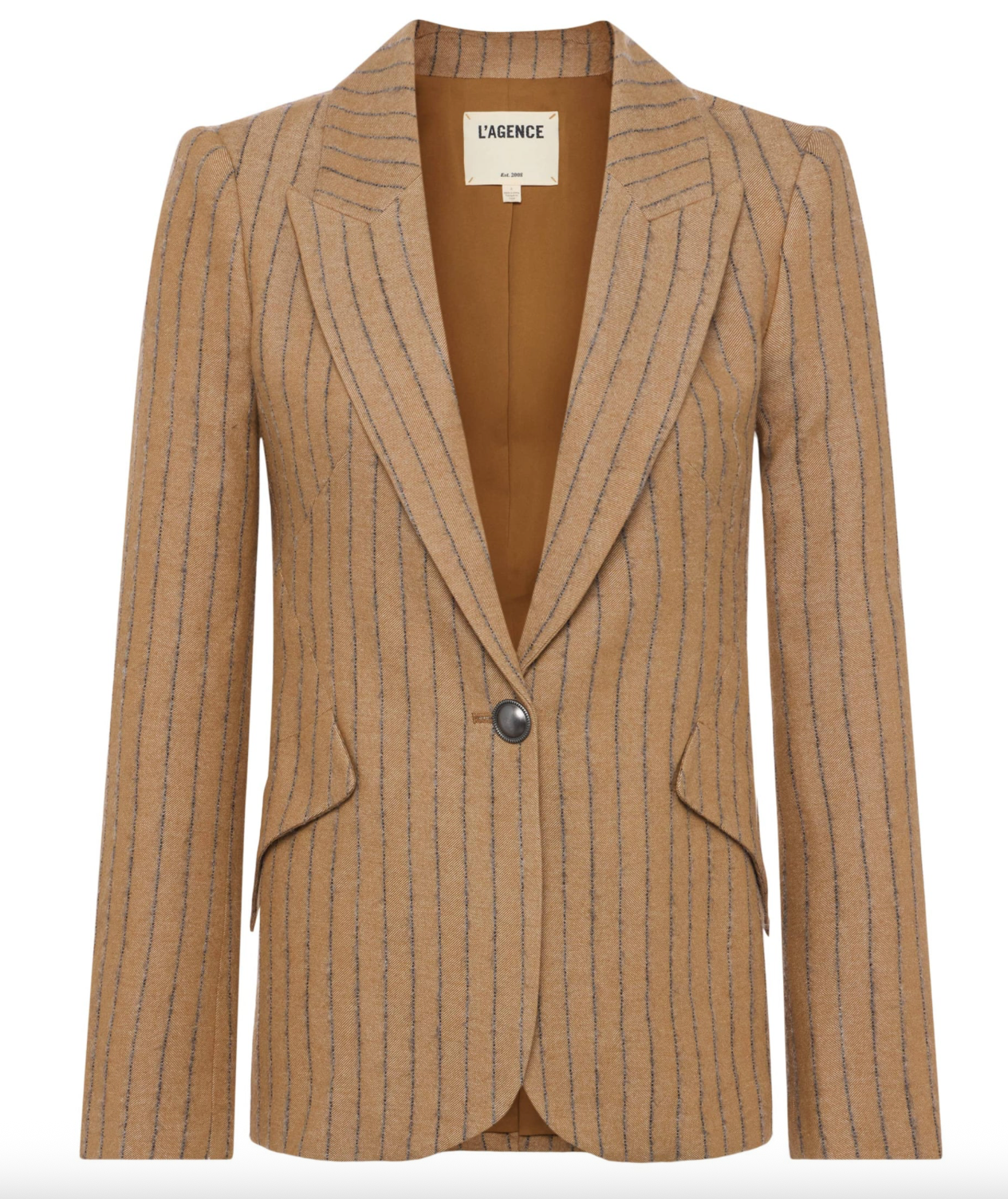 The chic design is defined by strong shoulders, sartorial peaked lapels, angled flap pockets, and expertly handled seaming that accentuates the hourglass shape. The elegant look fastens in front with a single tonal button. Fully lined.