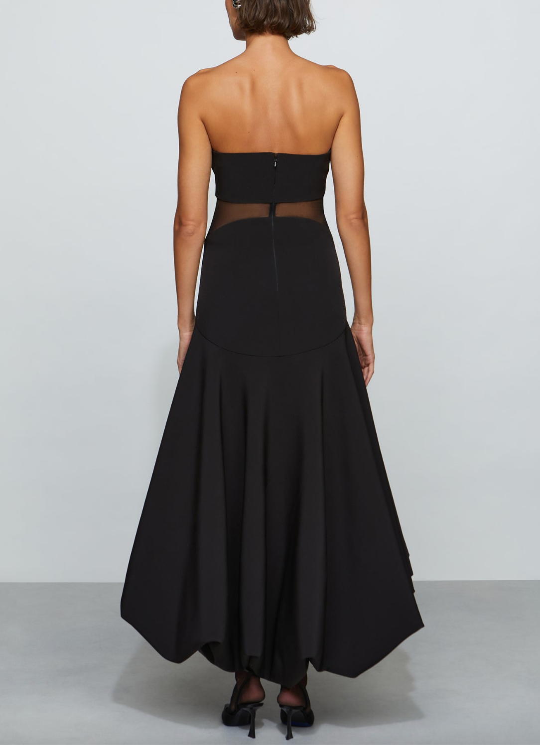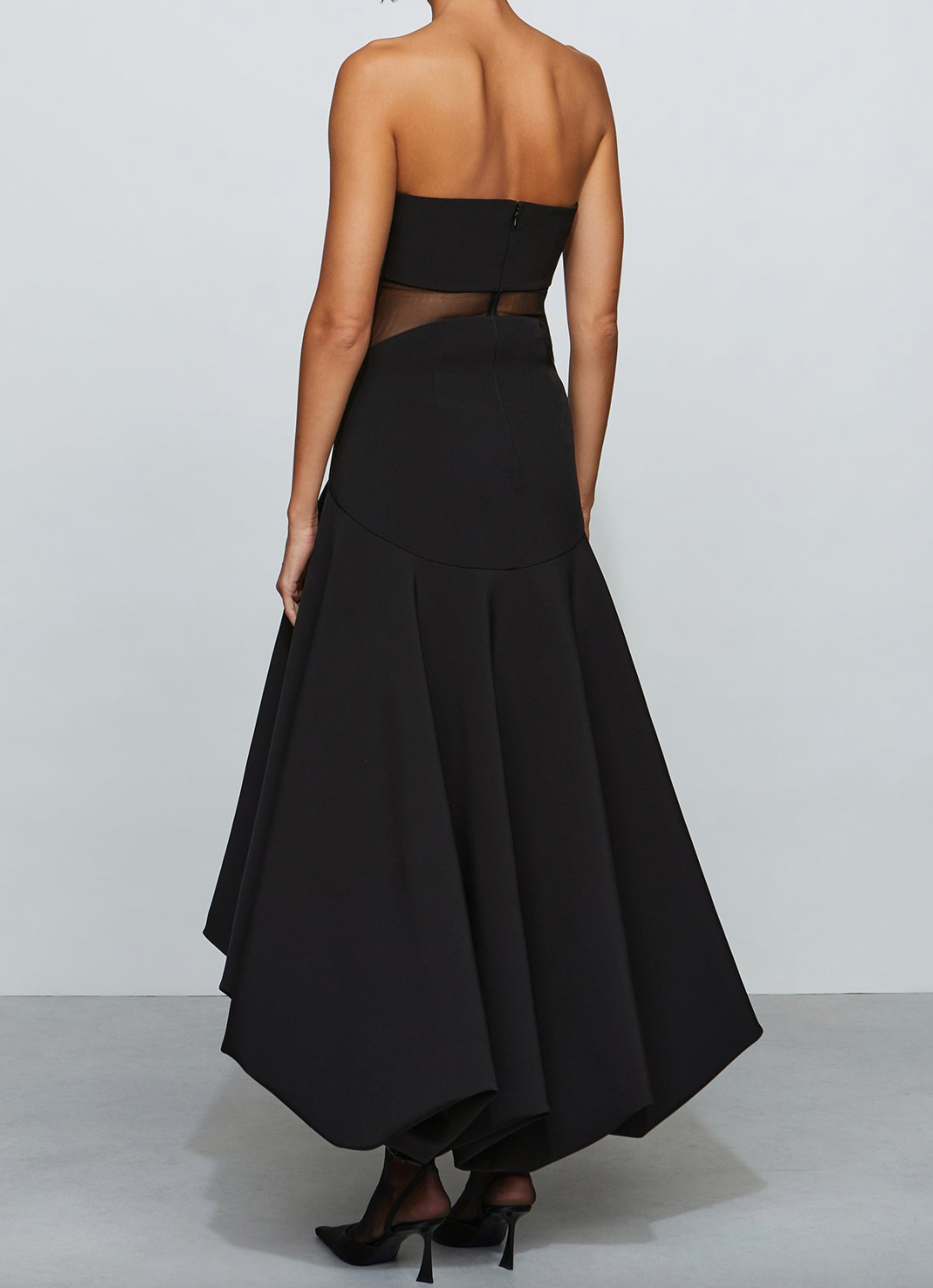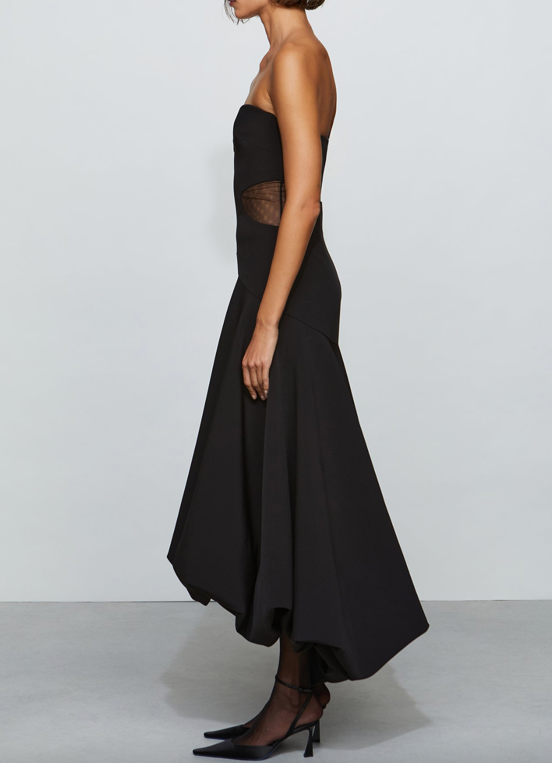 Modern glamour meets architectural design in this strapless cady midi dress, crafted from compact recycled polyester blend for a structured yet fluid silhouette. Featuring curved mesh cutouts that flatter the form and a sculpted flared bubble hem, this piece embodies bold femininity with refined precision.