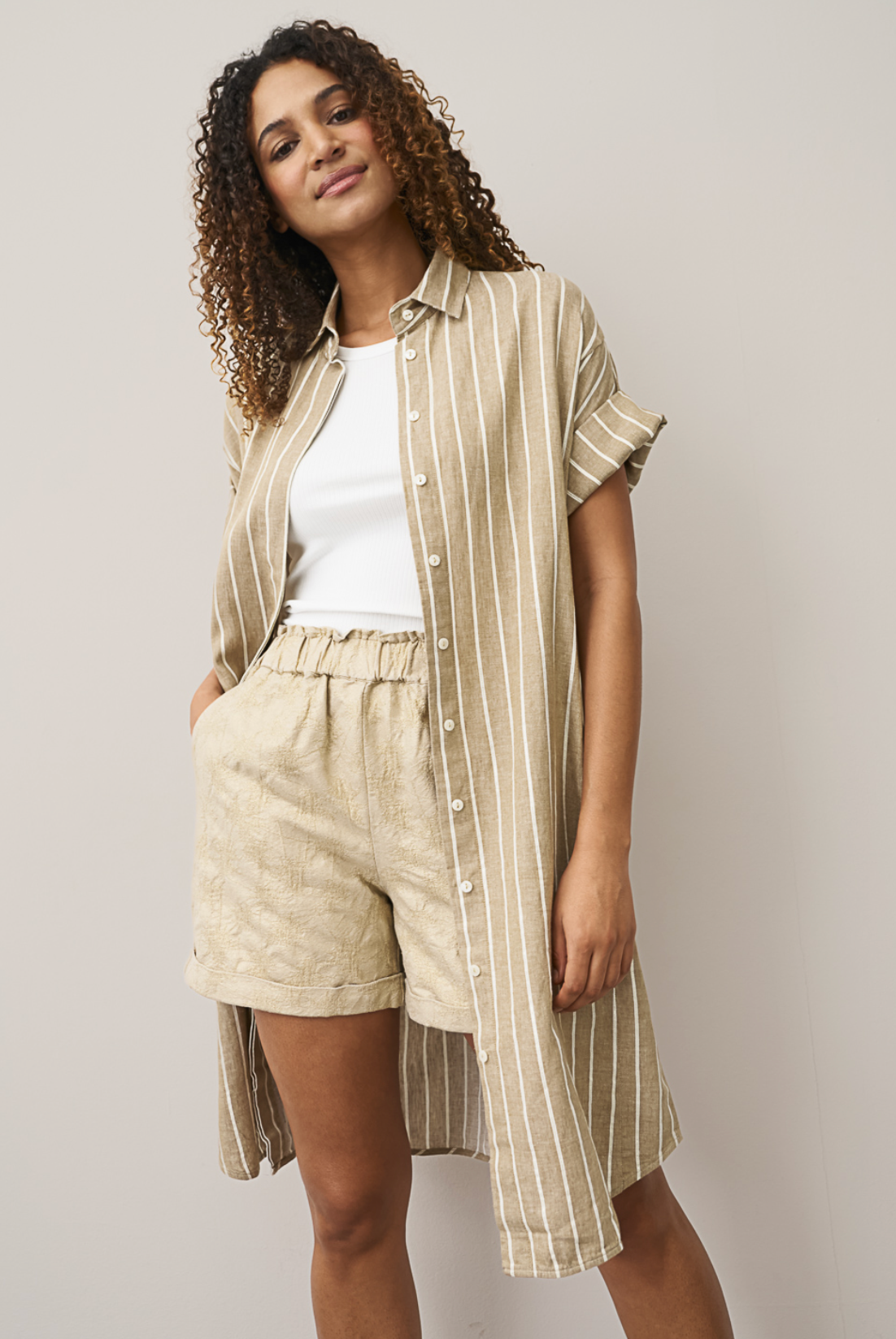 A timeless piece with effortless appeal, this shirt dress is designed in a straight-cut silhouette and crafted from breathable linen. Featuring an allover stripe print, it is finished with a continuous hidden button placket for a clean look, while a removable belt allows for adjustable shaping. Side pockets add everyday practicality to this easy, versatile style.