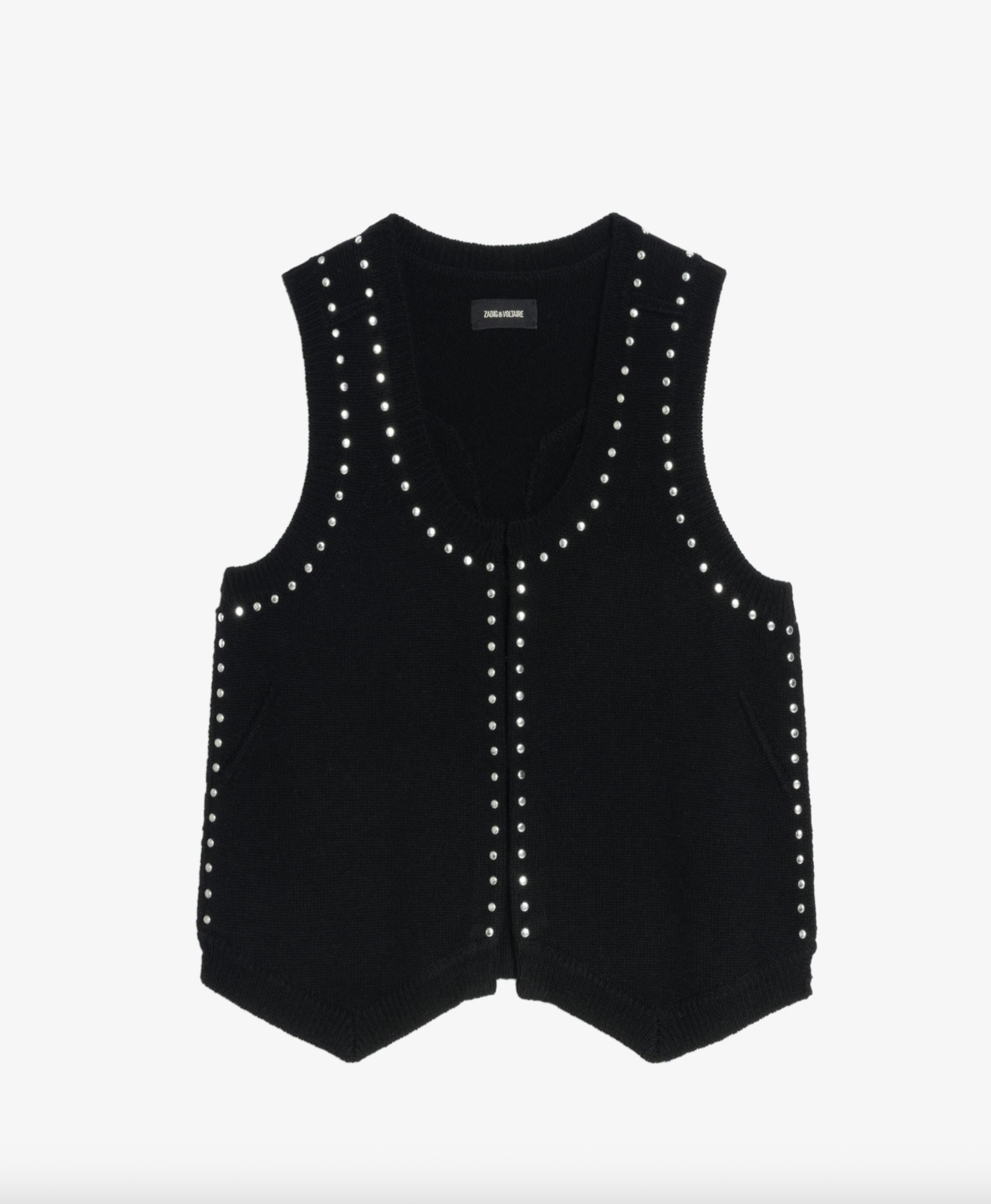 A modern twist on a classic silhouette, this wool-cashmere blend sweater vest is embellished with subtle studs for an edgy yet refined touch. Finished with a round neckline and signature safety pin closure for a unique statement look.