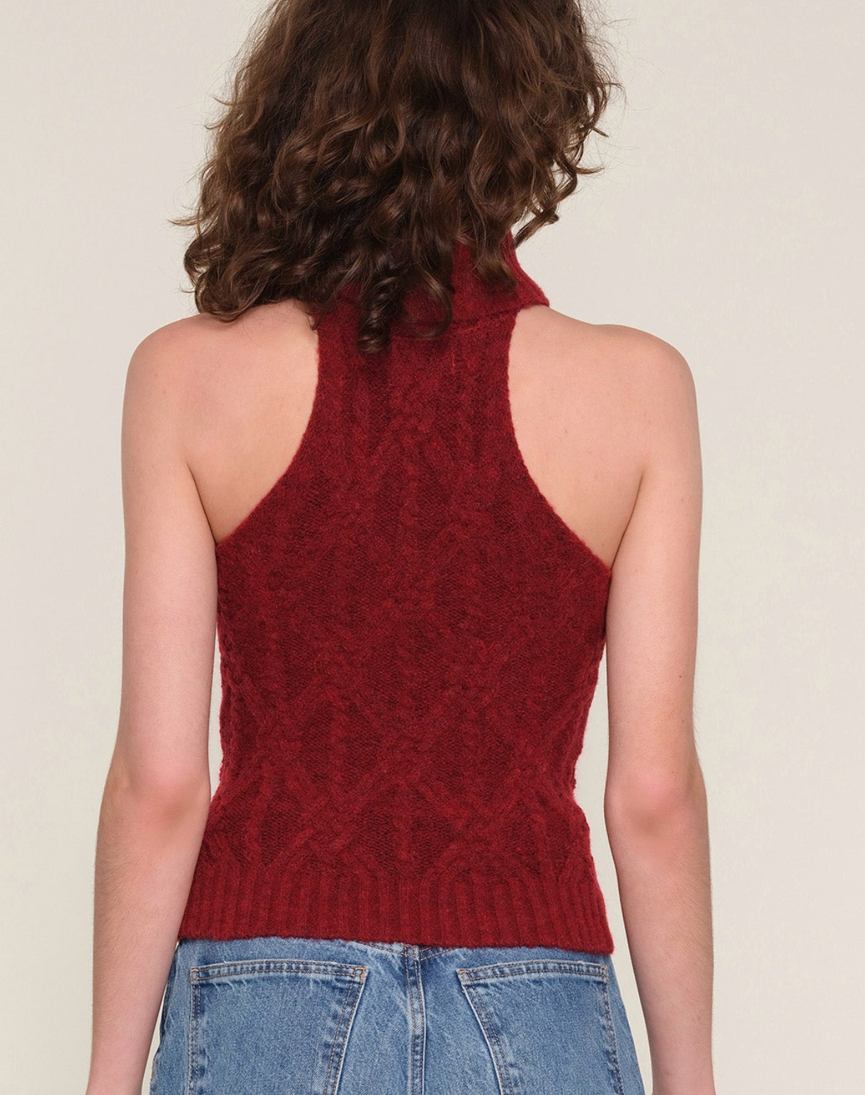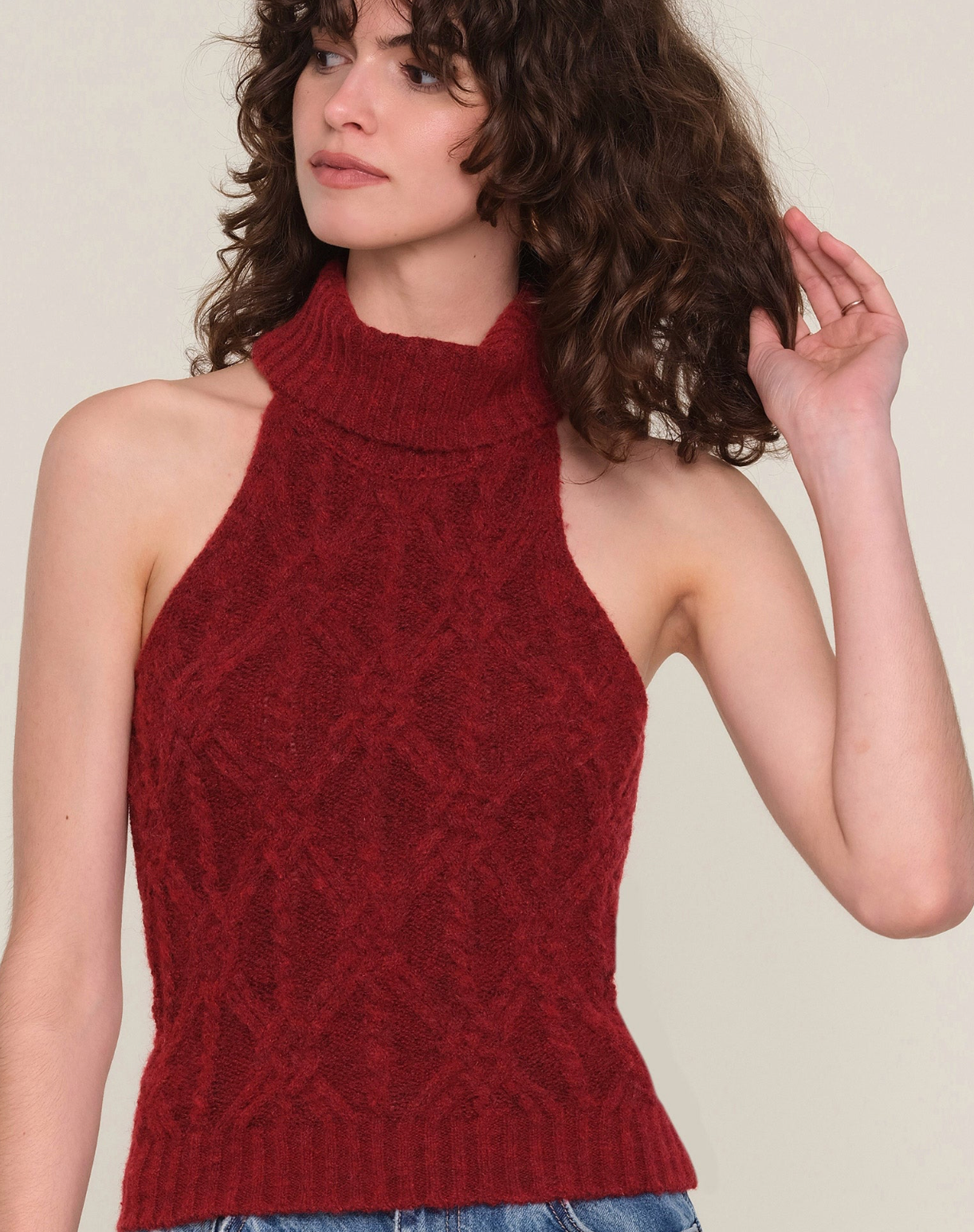 A modern take on a classic knit, the Elise Top features a slim, body-skimming fit with a halter-inspired mock neckline and a refined fold-over detail. The soft mélange knit adds texture, while the allover cable stitching brings a timeless, tactile finish. Perfect for pairing with trousers, denim, or layered under a tailored jacket.