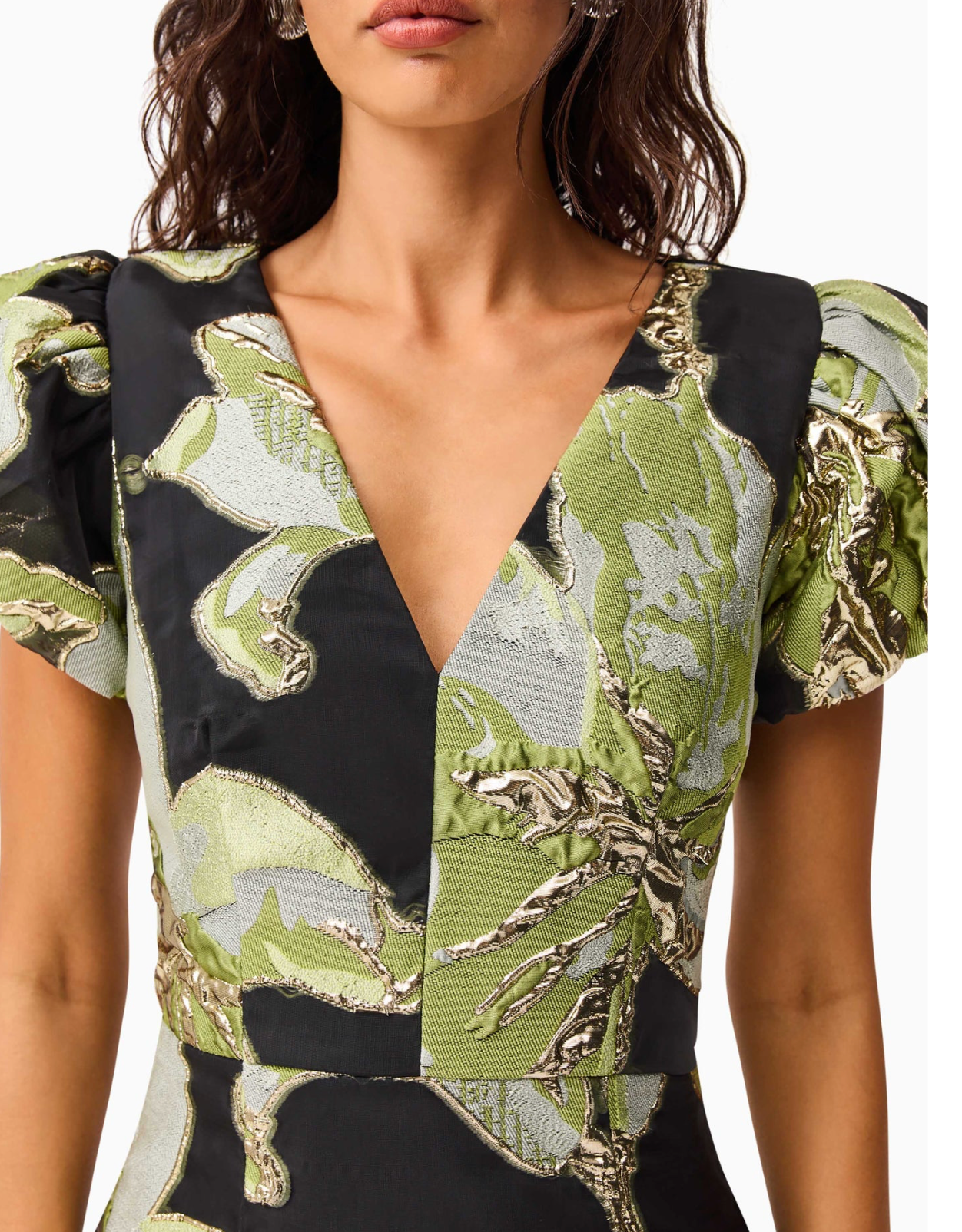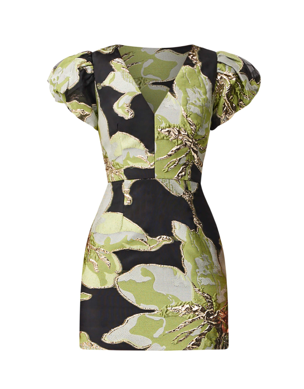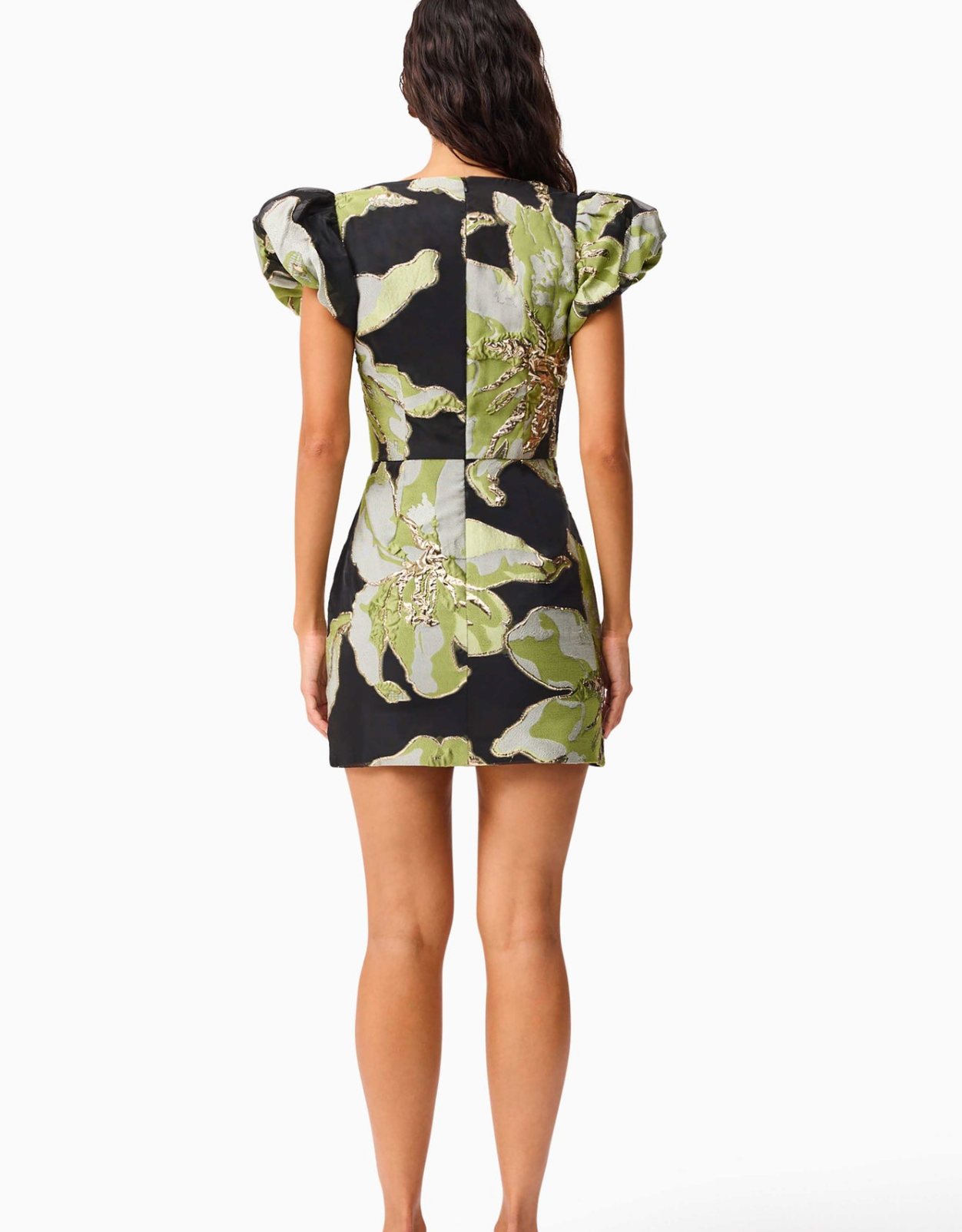 Bold florals meet timeless charm in the Elysia Cap Sleeve Mini Dress in Black & Green. Crafted from a medium-weight jacquard that showcases intricate woven detailing, this mini offers eye-catching texture with an effortlessly elevated feel. The V-neckline highlights the décolletage, while the puff sleeves introduce a touch of romantic volume and polished femininity.