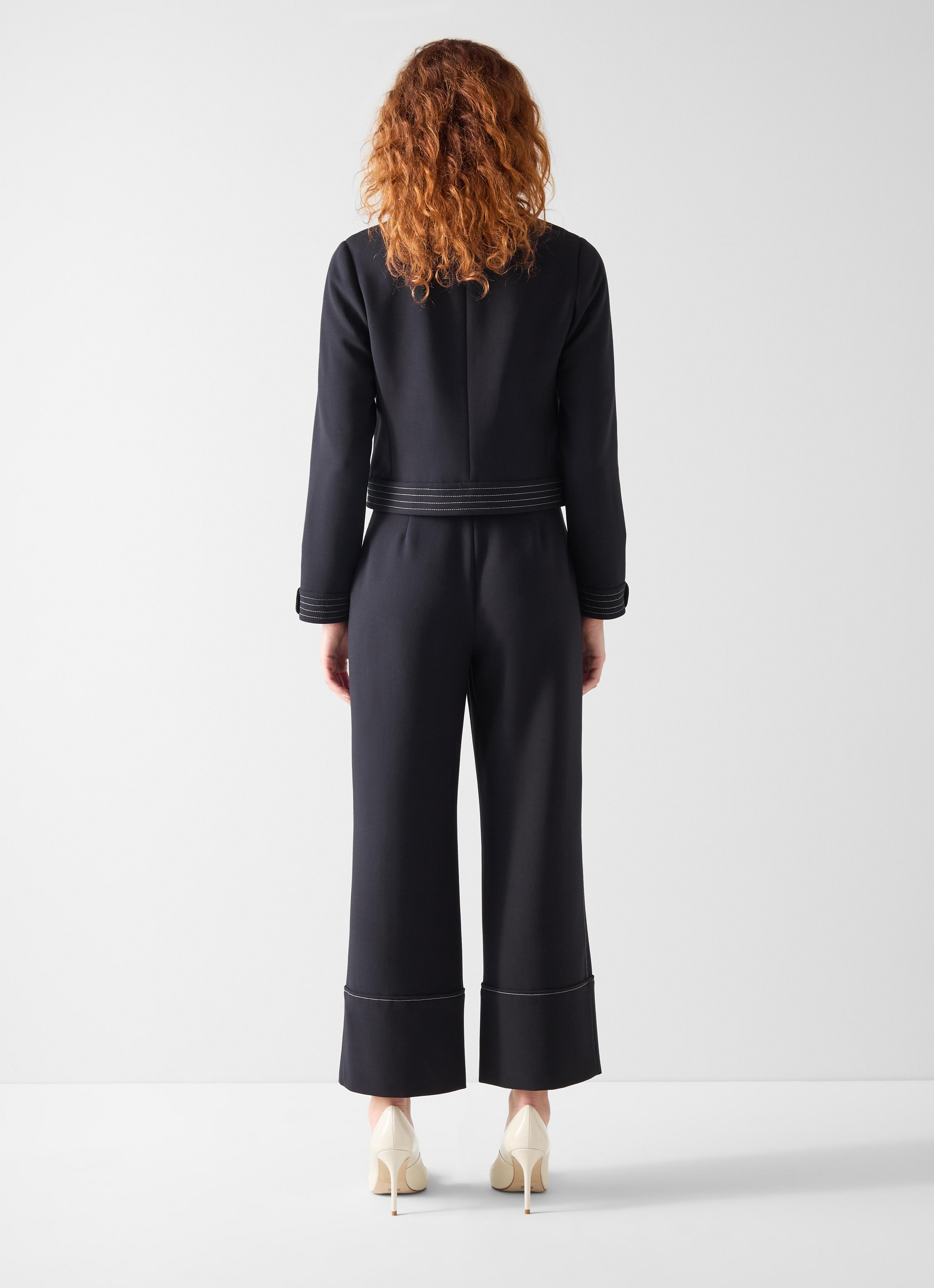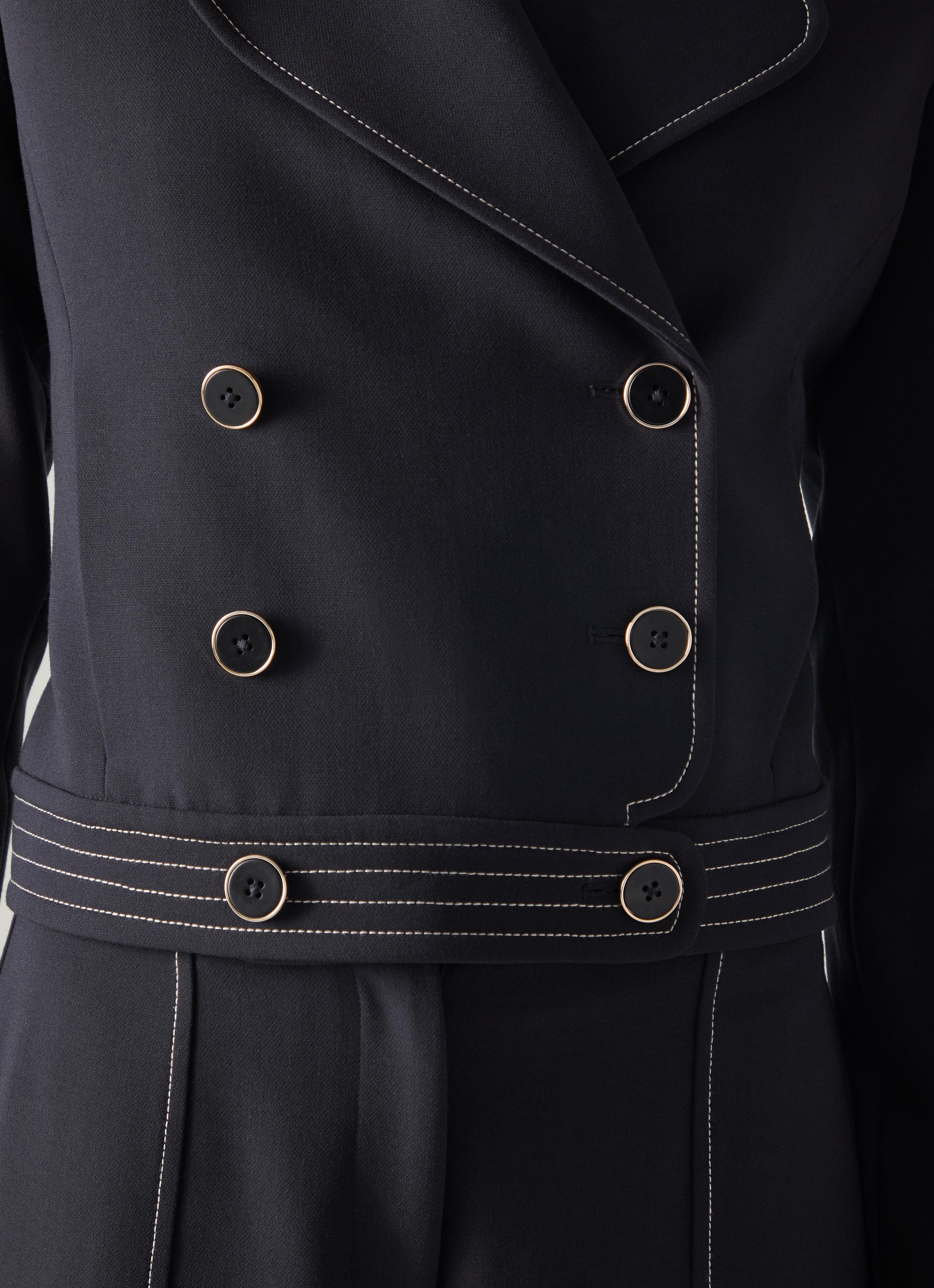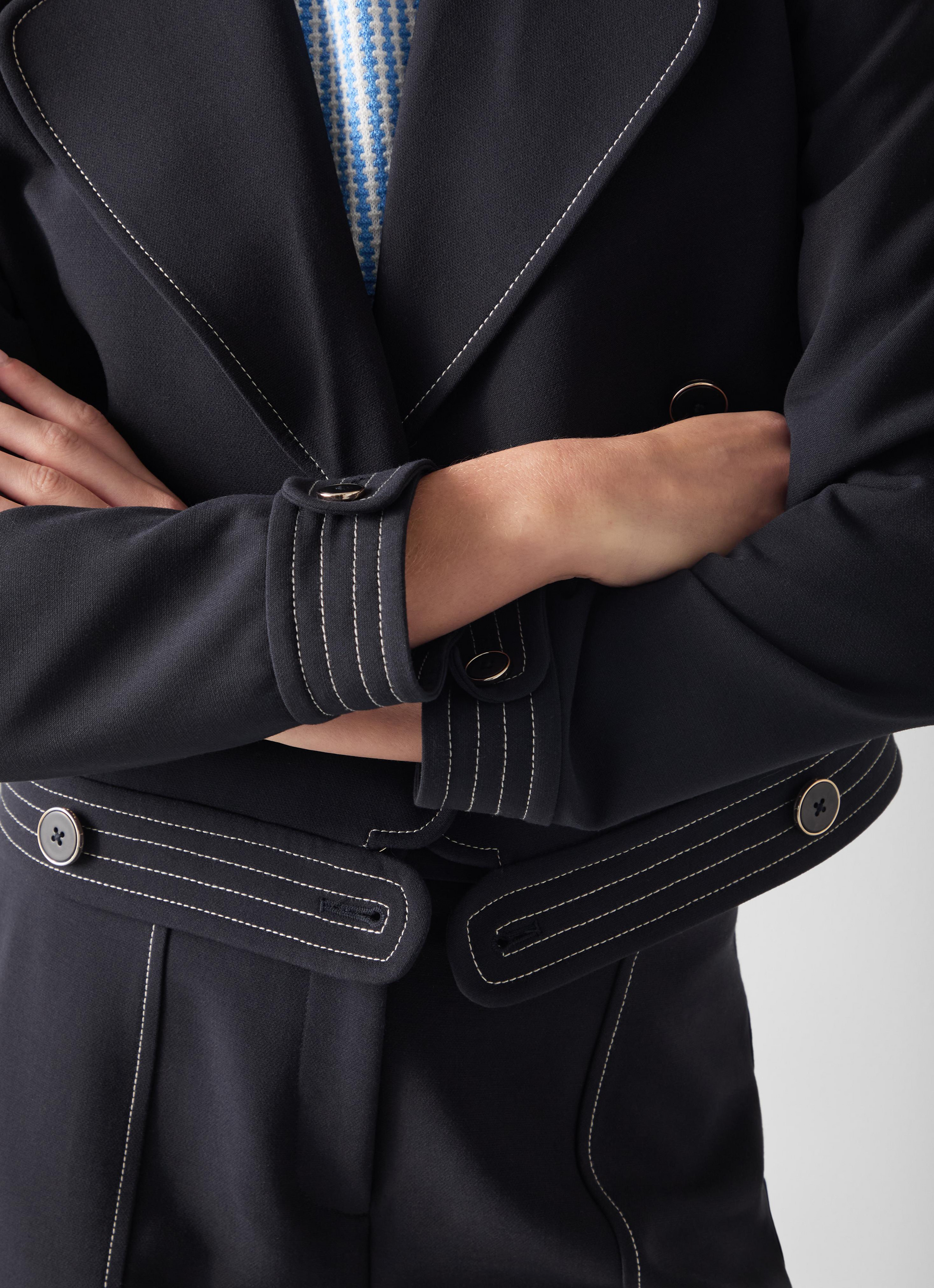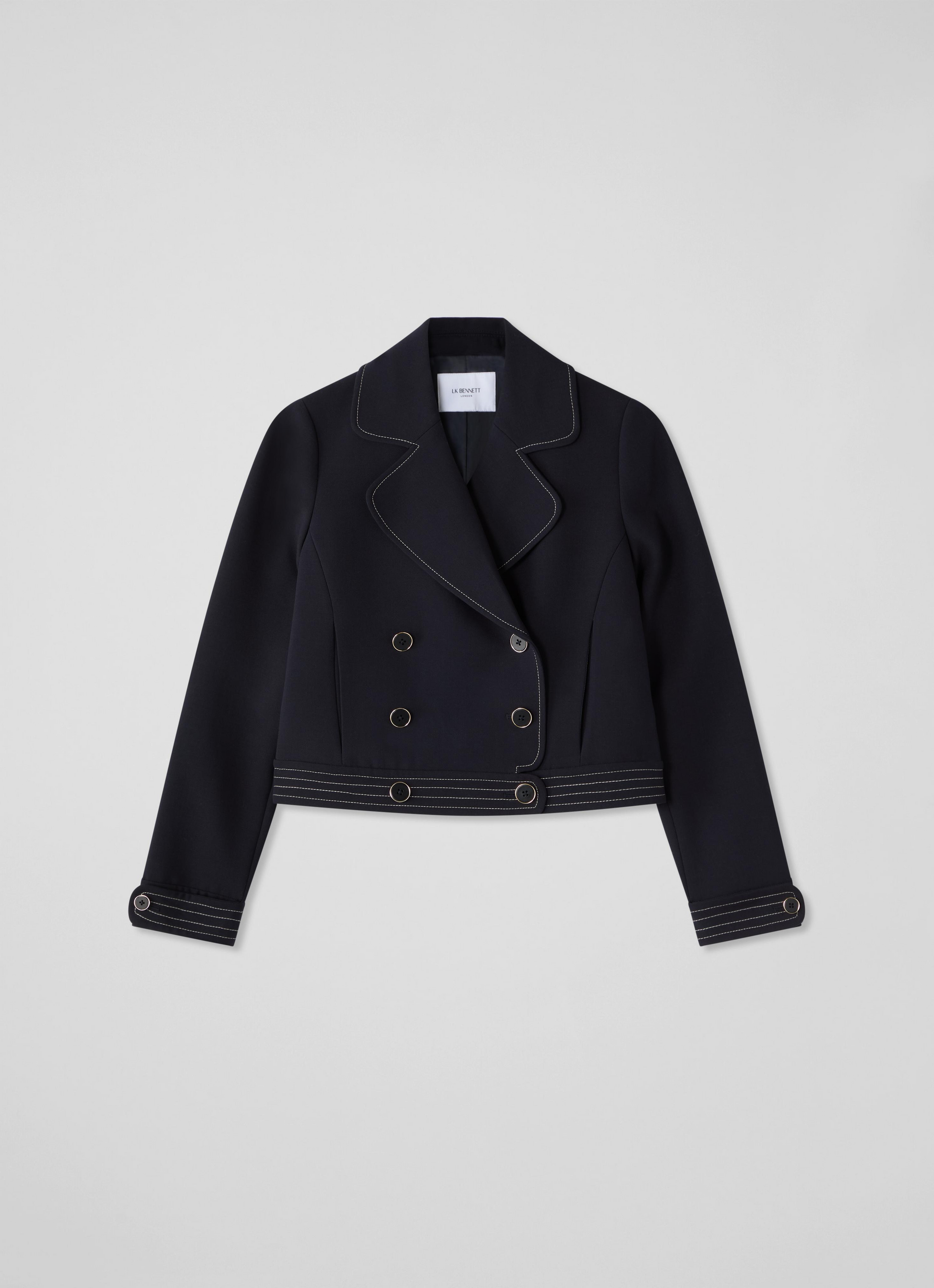 Tailored navy cropped jacket with sharp double-breasted front and contrast stitching. Structured silhouette balances modern proportions for elevated layering. Wear over high-waist trousers or a fitted dress for work or evening.