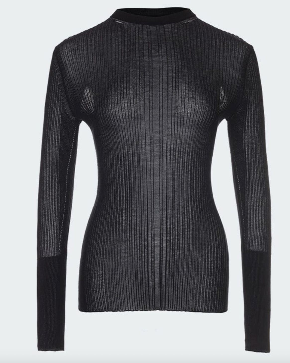 Feather-light and effortlessly feminine, this rib knit top is crafted from a fine cotton blend with a sheer finish and subtle metallic tipping at the sleeves. Its slim, close fit makes it the perfect layering piece—light enough to wear under outerwear, yet striking enough to style on its own. Pair it with wide-leg pants for a relaxed, chic look or tuck into a skirt for a more polished feel.