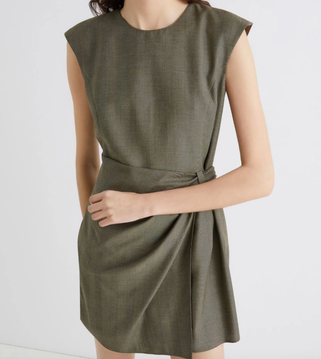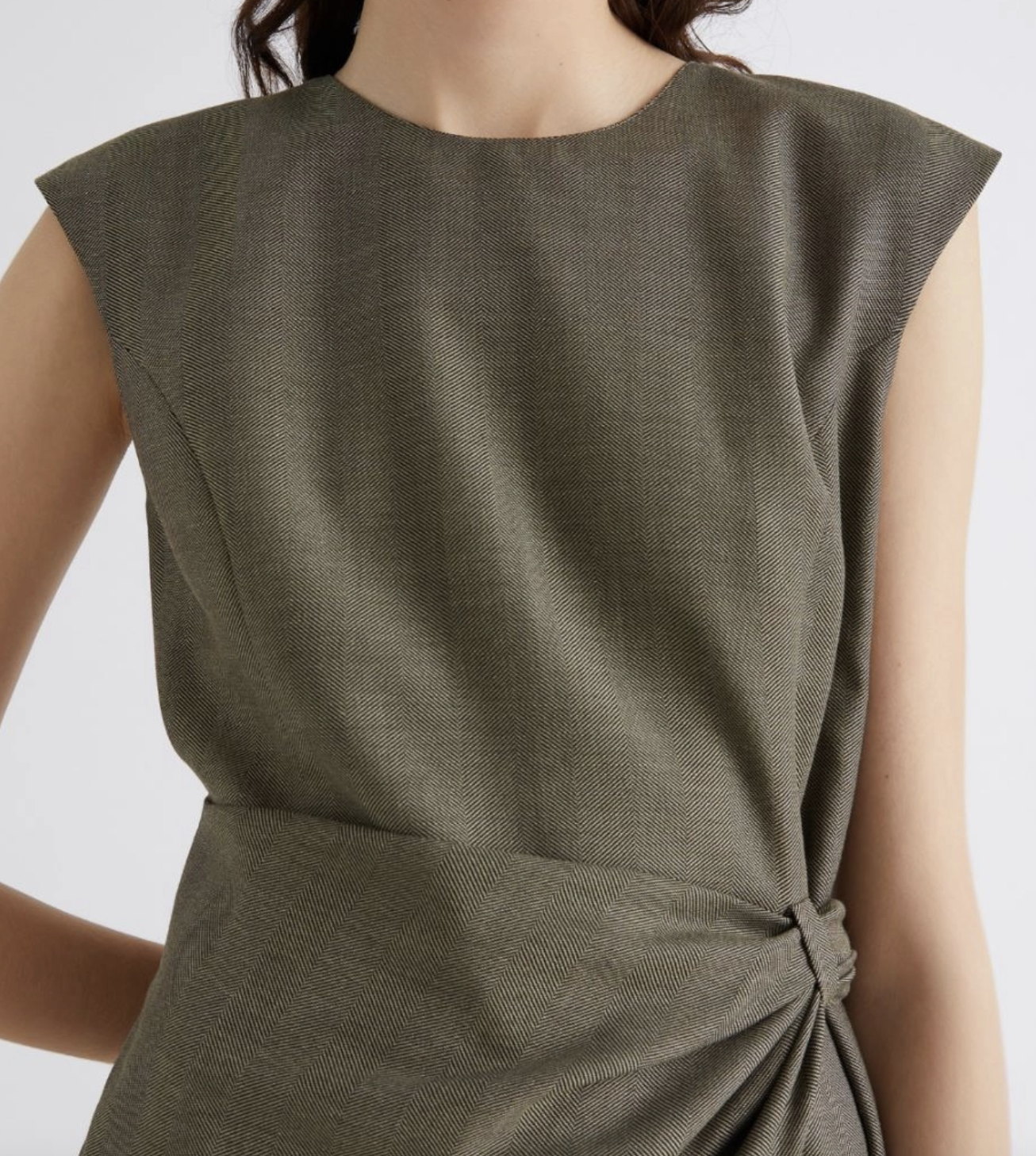 A refined update to the classic sheath dress, this style is crafted from a soft wool–viscose twill with a subtle herringbone look. Designed with a clean crew neckline and covered shoulders, it features a side knot and sash detail that adds graceful movement to the bodice. Perfect for pairing with jewelry and a clutch for an instantly polished look.