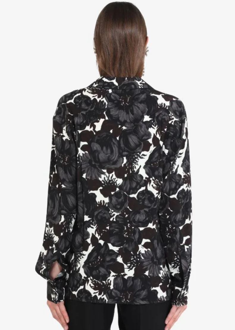 A white base color shirt with an artistic floral print, camp collar and drop shoulder. Classic with long sleeves and button cuffs, patch front pockets and a curved hem.