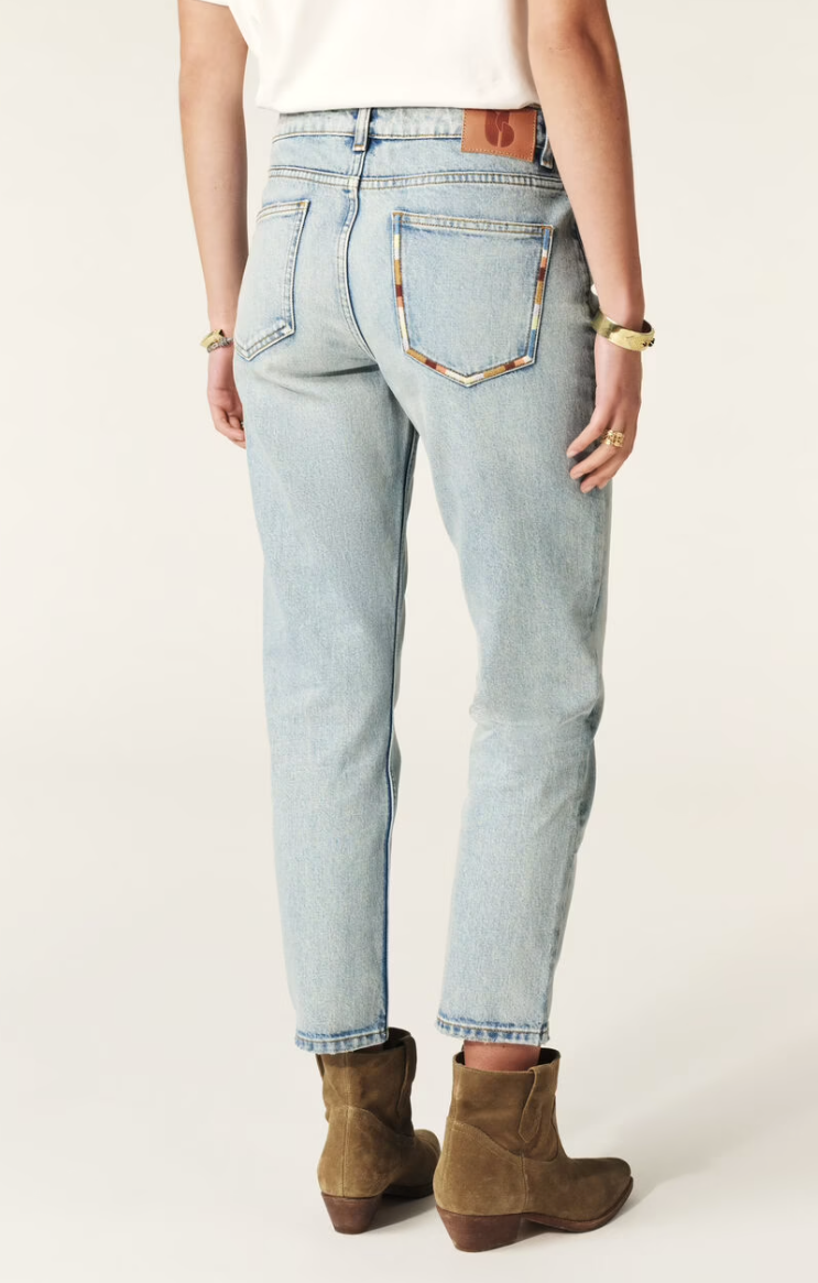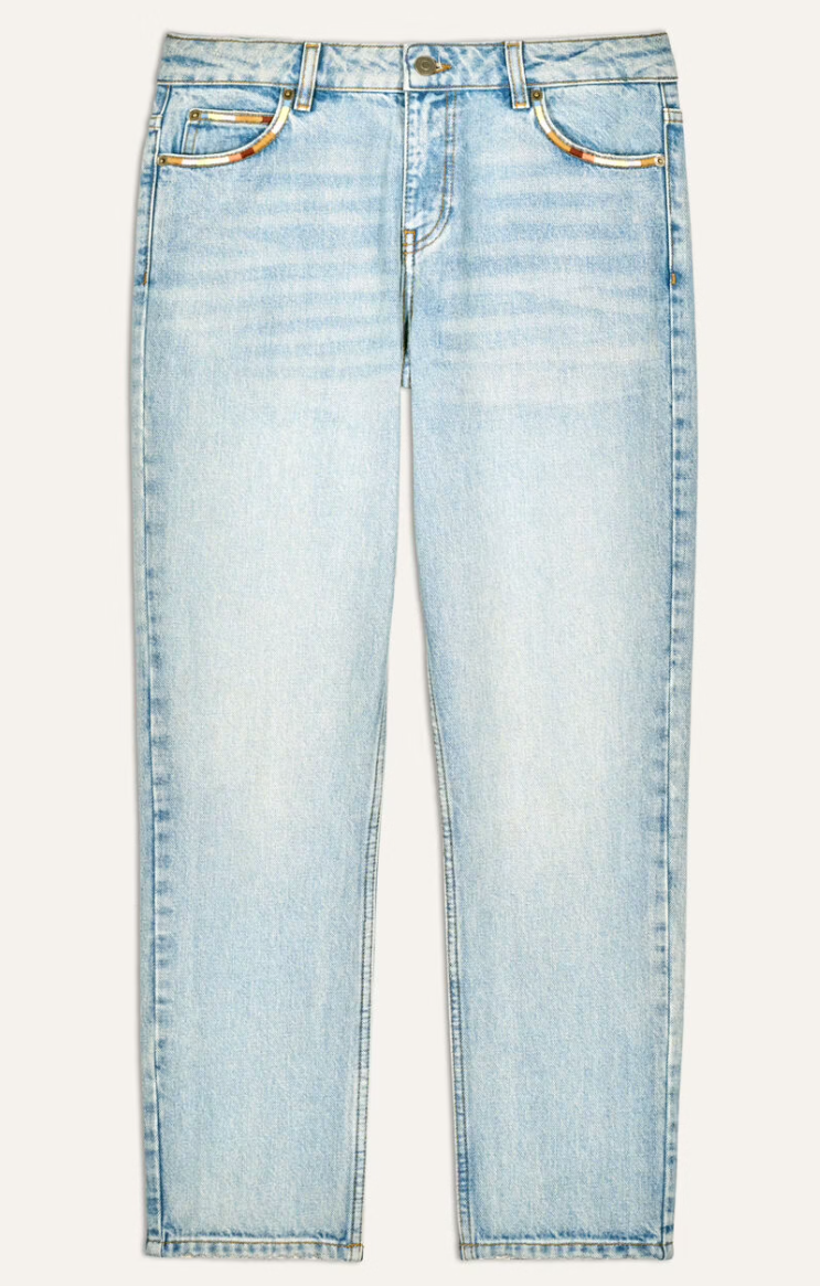 Elevate your denim collection with these Cropped Ankle Jeans in a fresh light wash. Featuring a classic button and zipper closure with belt loops for a customized fit, these jeans offer a flattering straight cut and 7/8 length for a chic, cropped silhouette. The patch pockets at the back and denim-style pockets at the front add timeless style, while multicolored embroidery details around the front and right back pockets bring a playful, signature touch. Finished with the ba&sh label on the back, these jeans are the perfect mix of casual and contemporary.