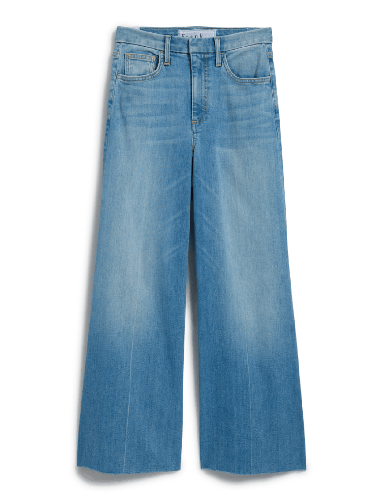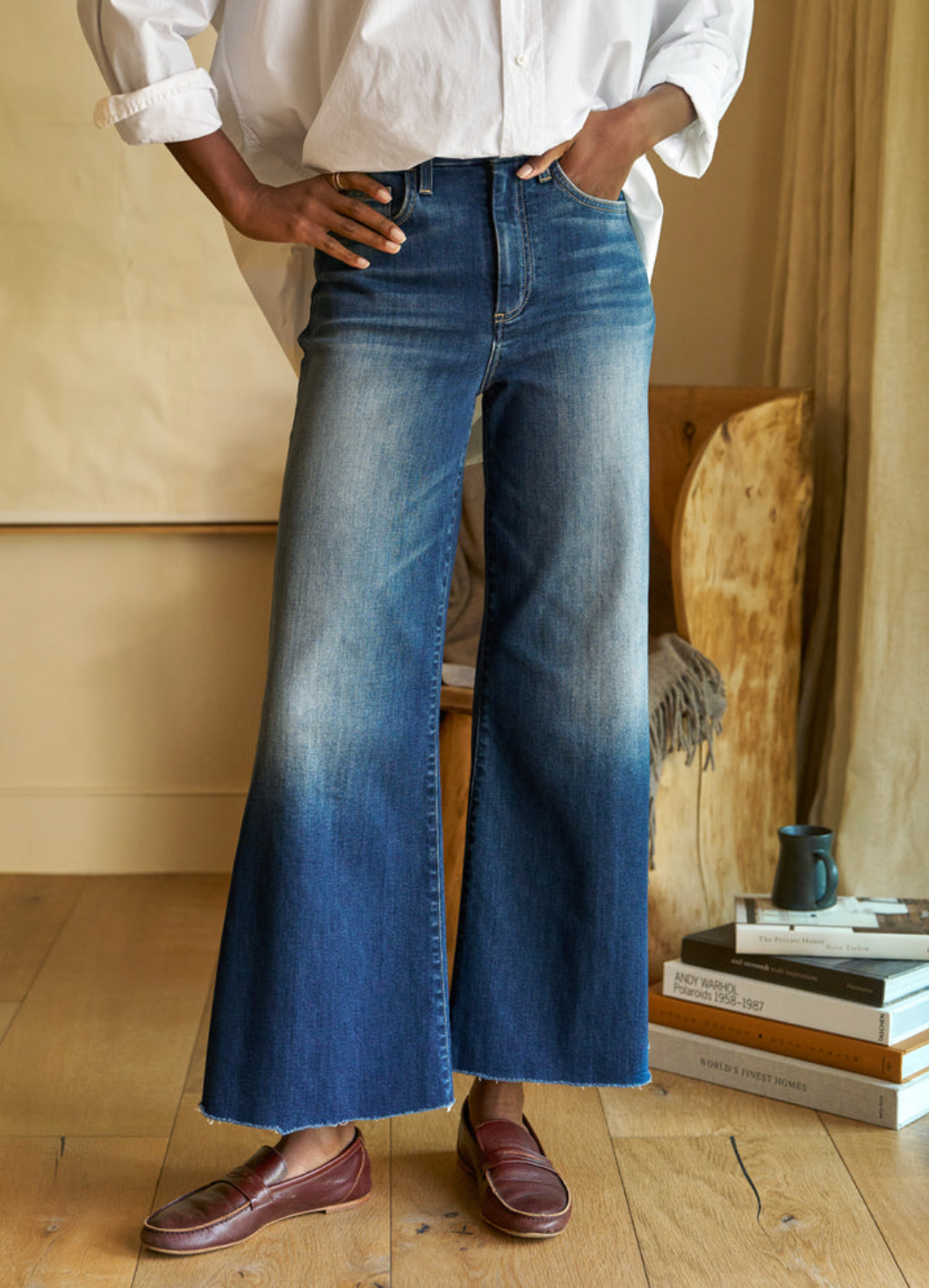 - Note the cropped, hand-distressed hem