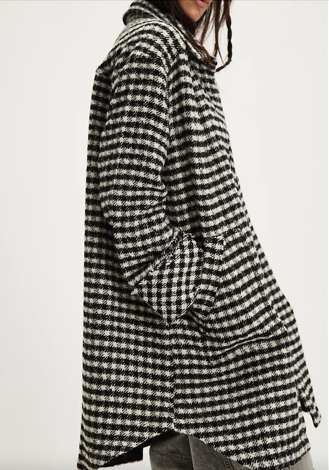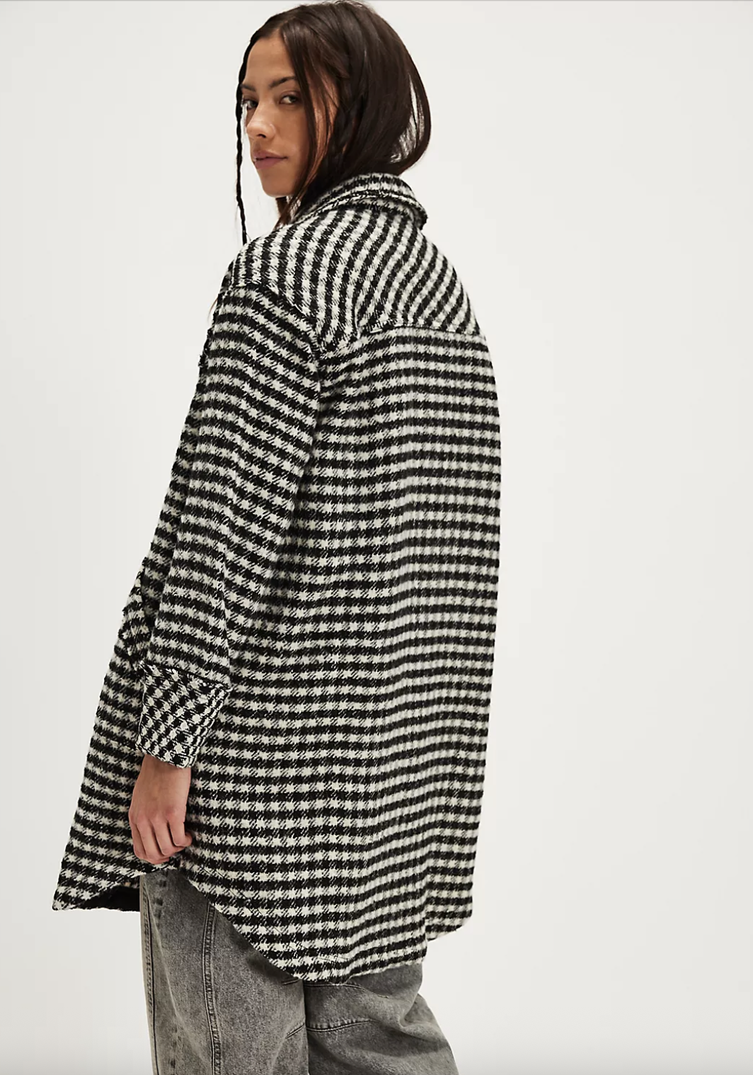 A polished take on a classic layer, this shirt jacket features a refined houndstooth fabrication and a longline silhouette. Finished with a collared neckline and patch-pocket detailing, it blends timeless tailoring with everyday ease — perfect for effortless layering.