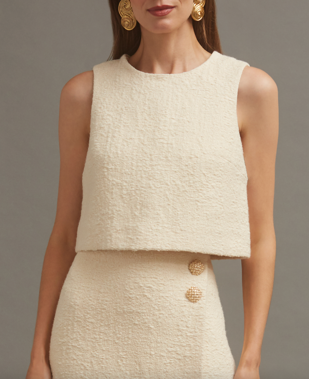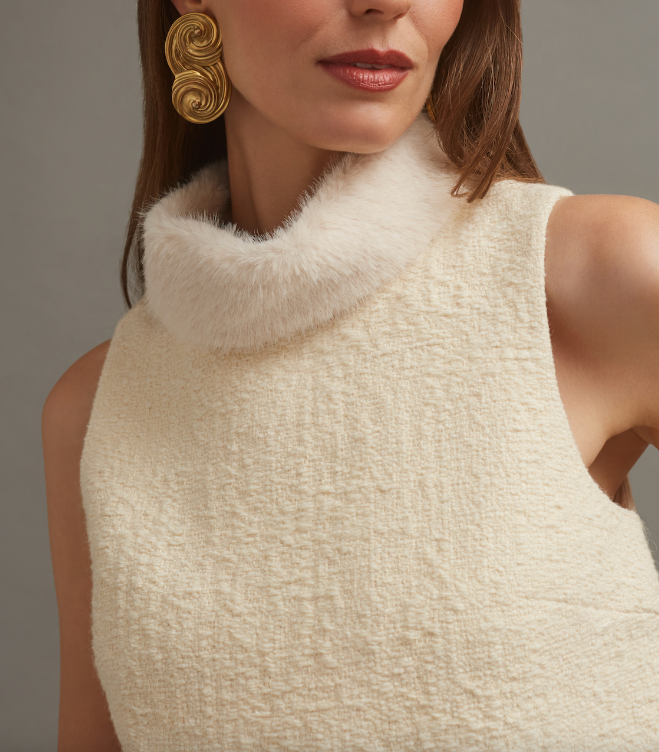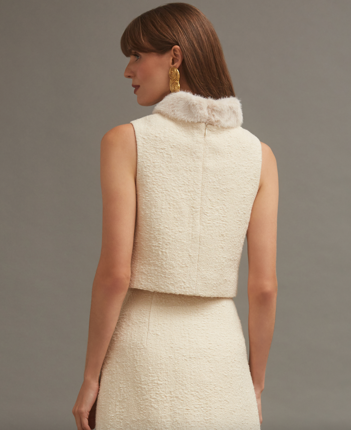 A refined take on a classic shell silhouette, elevated with a touch of luxe. Crafted from a soft Italian boucle blend, this sleeveless top features a fully detachable faux fur collar for versatile styling. Designed with bust darts for a flattering fit and finished with a sleek invisible back zip, it’s a chic layering piece that transitions seamlessly from day to evening.