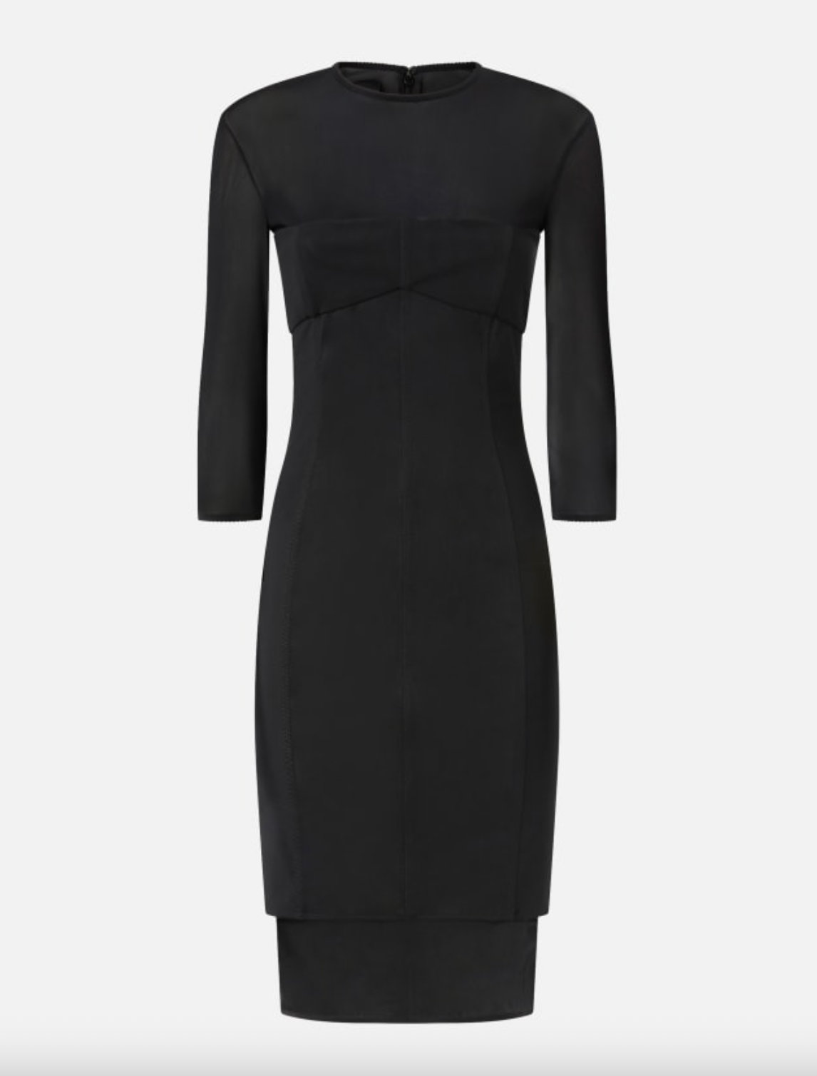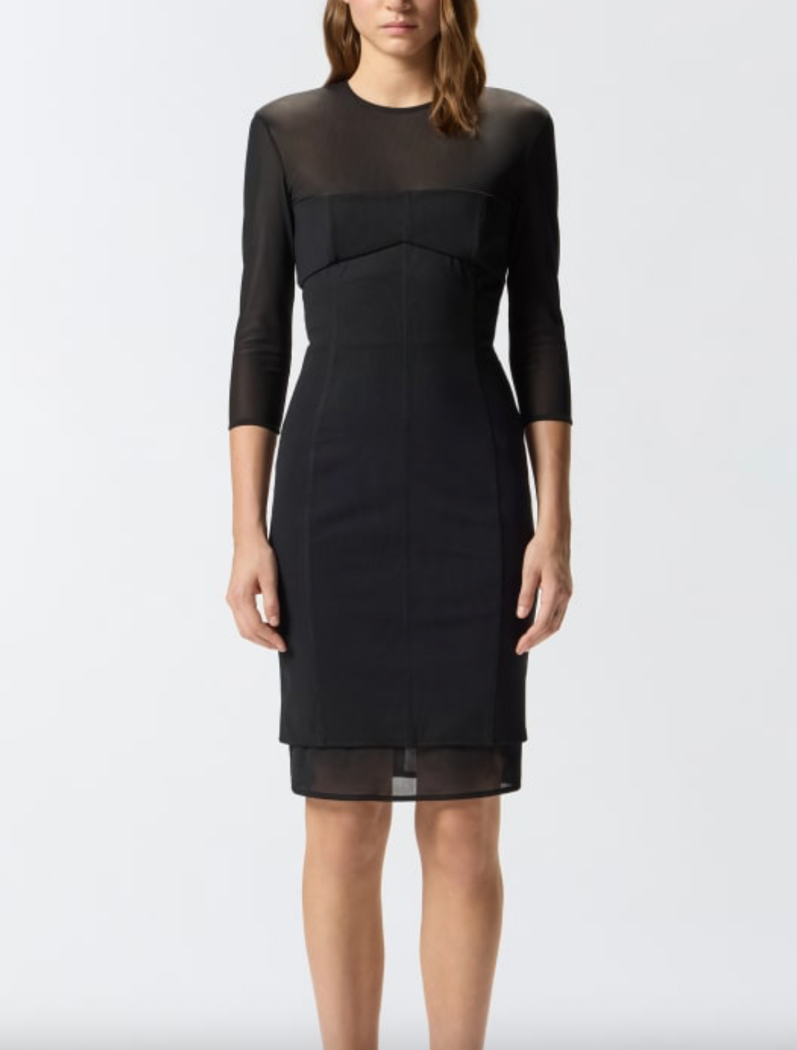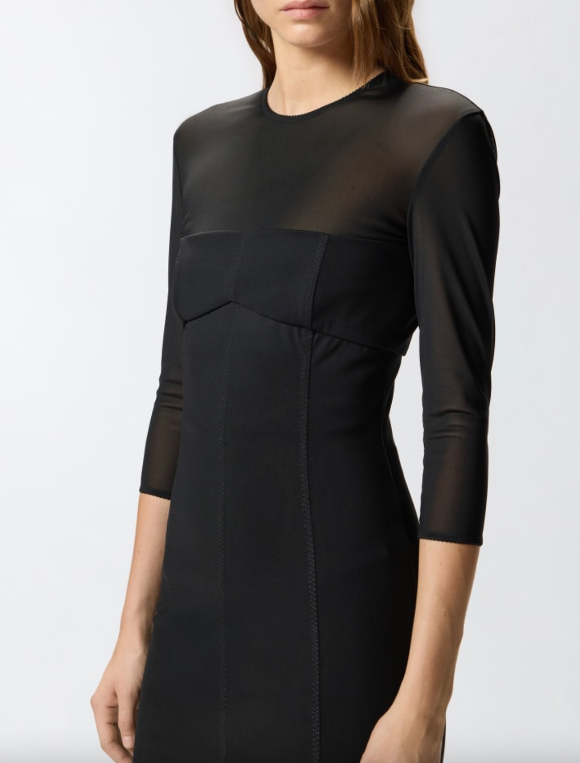 A modern balance of structure and sensuality, this slim-fit knee-length dress is crafted from a highly elastic polyamide blend that sculpts and smooths the figure with a natural shaping effect. Designed with long sleeves and a full-length back zipper, it offers both comfort and freedom of movement while maintaining a refined, body-hugging silhouette. Sheer panels at the arms and chest lend a subtle allure, creating a look that’s both sophisticated and striking—ideal for evening occasions or elevated nights out.
