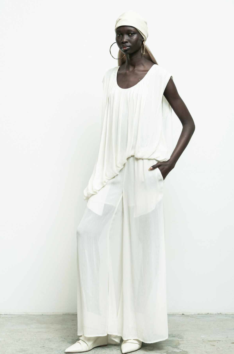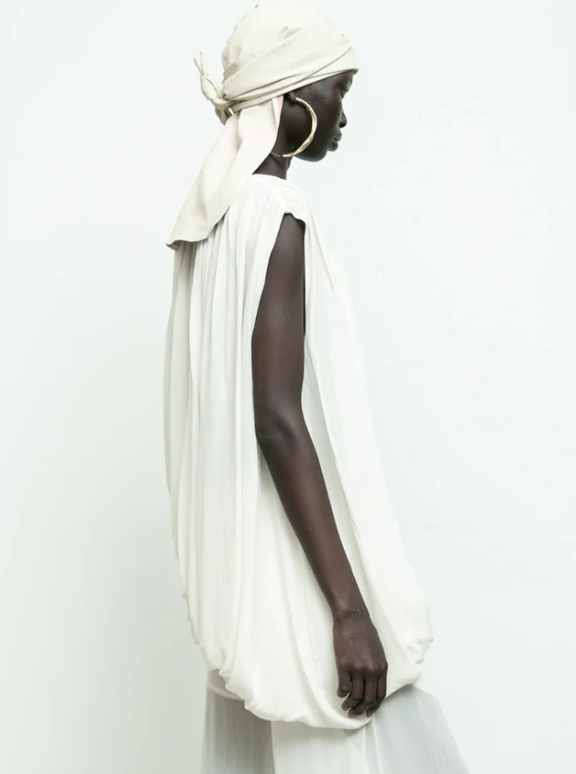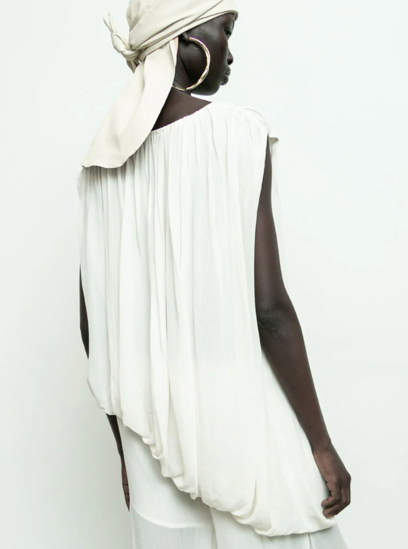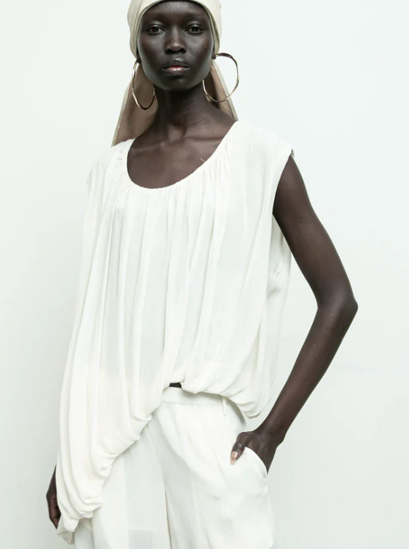 100% viscose georgette/ asymmetrical drape/ scoop neck/ shirring detail/ sleeveless
