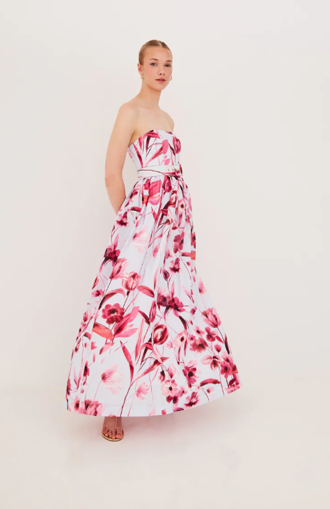 This strapless bustier maxi dress is crafted from crisp 100% cotton poplin and designed to sculpt and flatter. Featuring a sweetheart neckline, boned bodice, and waist-defining pleats, this women’s printed maxi dress blends structured support with effortless elegance. Finished with a removable belt, smocked back panel, and a subtle side slit, it’s the perfect statement piece for warm-weather occasions.