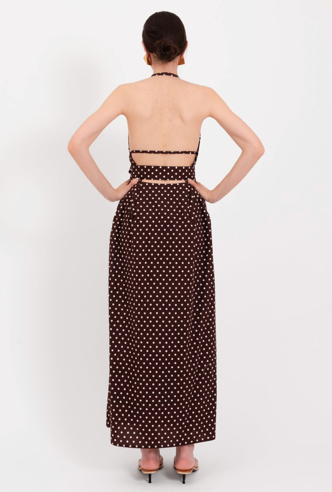 A timeless yet playful silhouette, this long dress features a halter-style V-neckline that ties at the back of the neck, revealing an elegant open back. A wide waistband with a front knot detail defines the shape, while the brown base with cream polka dots adds a classic, feminine charm.