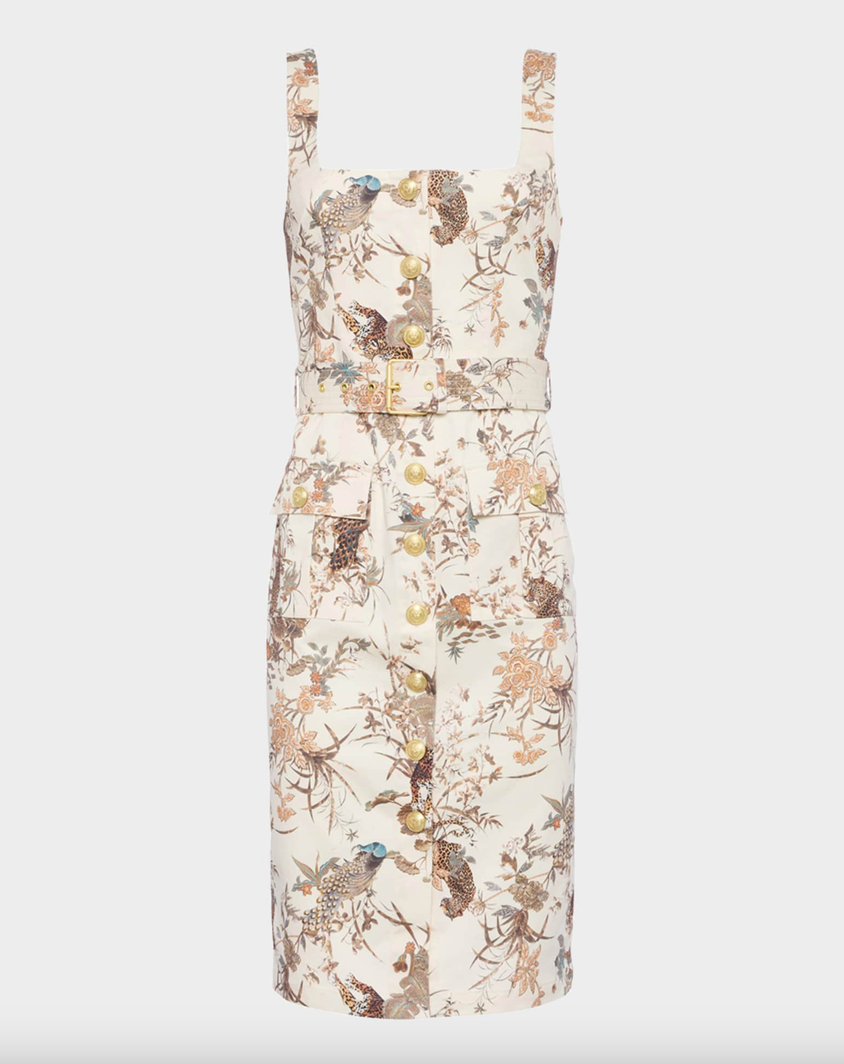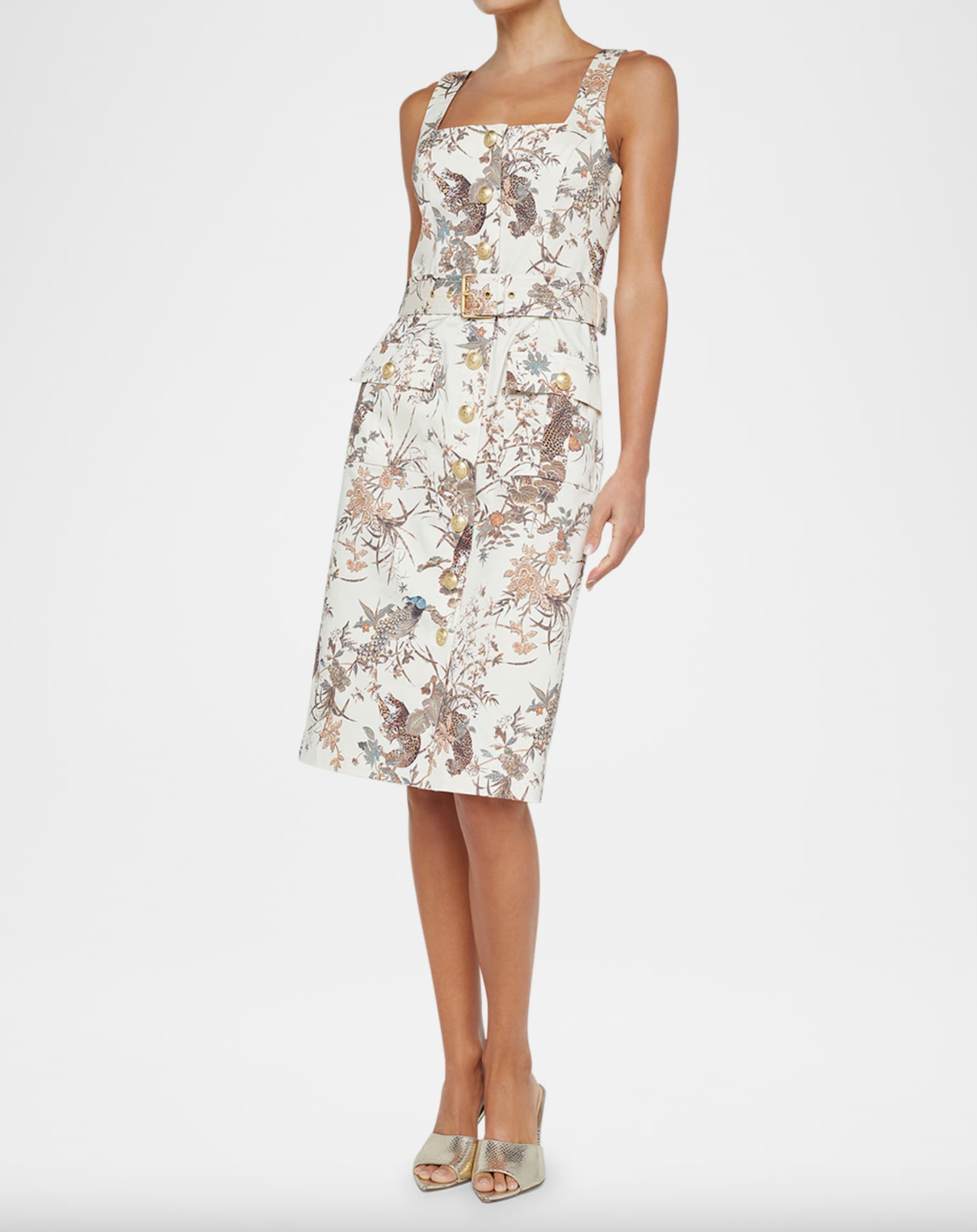 The L'Agence "Idy" tank dress combines effortless style with a bold, sophisticated twist. Featuring a striking Tapestry Jungle print, this dress is elevated by golden embossed-dome buttons that add a touch of refinement. The square neckline and sleeveless design create a modern look, while the adjustable belted waist allows you to customize the fit to your preference. Front buttoned-flap pockets offer both practicality and style, while the sheath silhouette flatters your figure. Perfect for both daytime events and evening outings, this dress offers a chic and versatile option for any occasion.