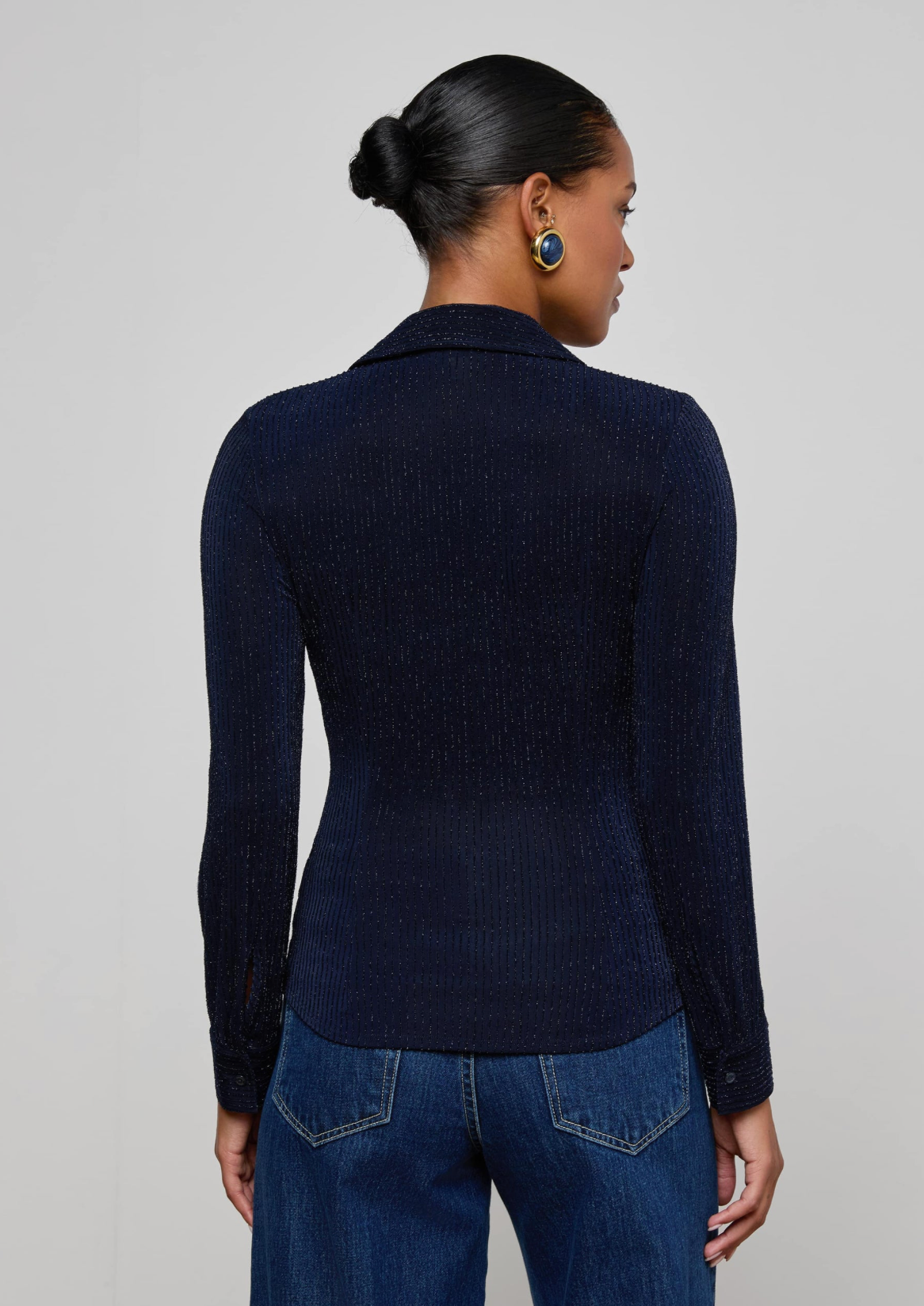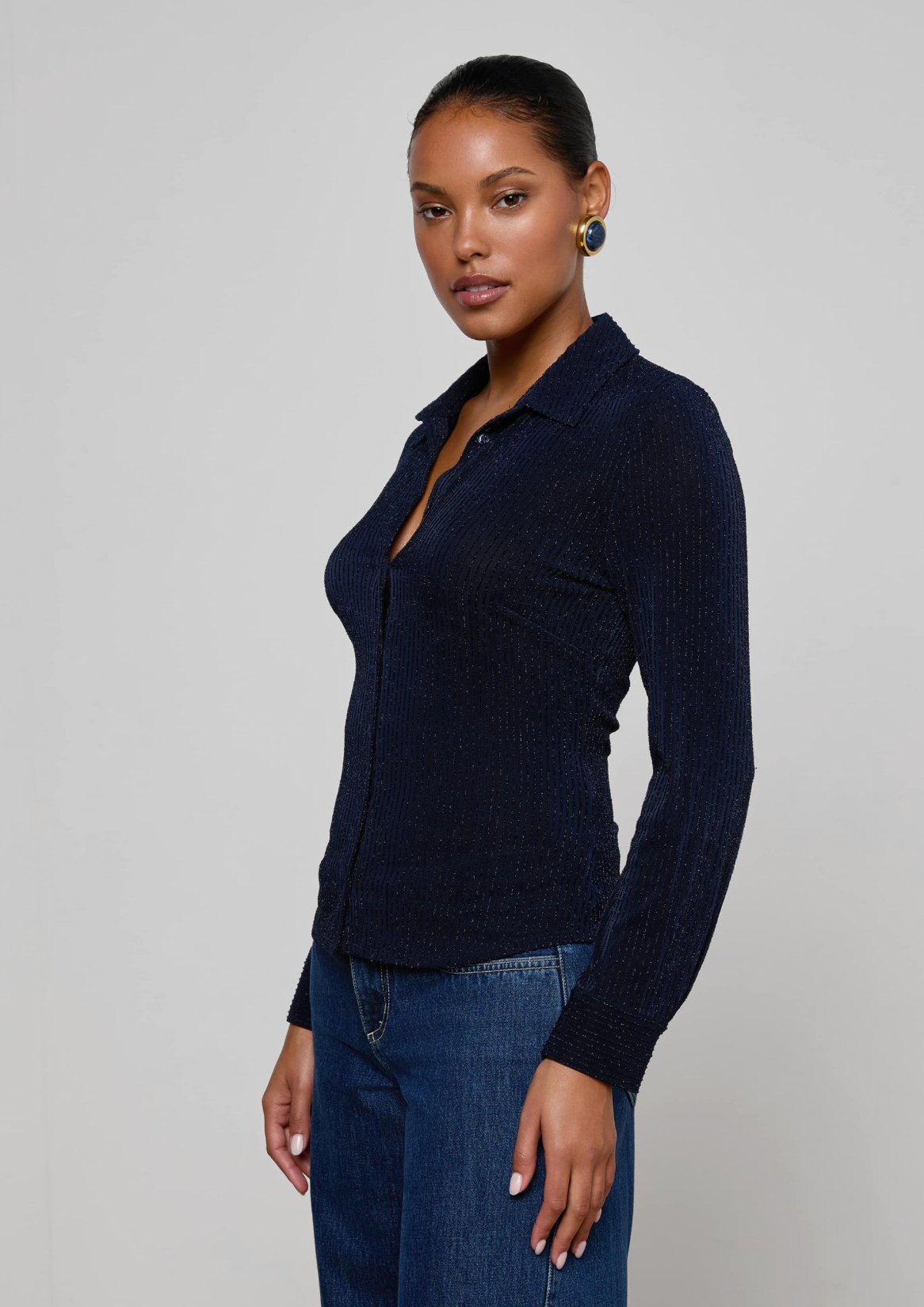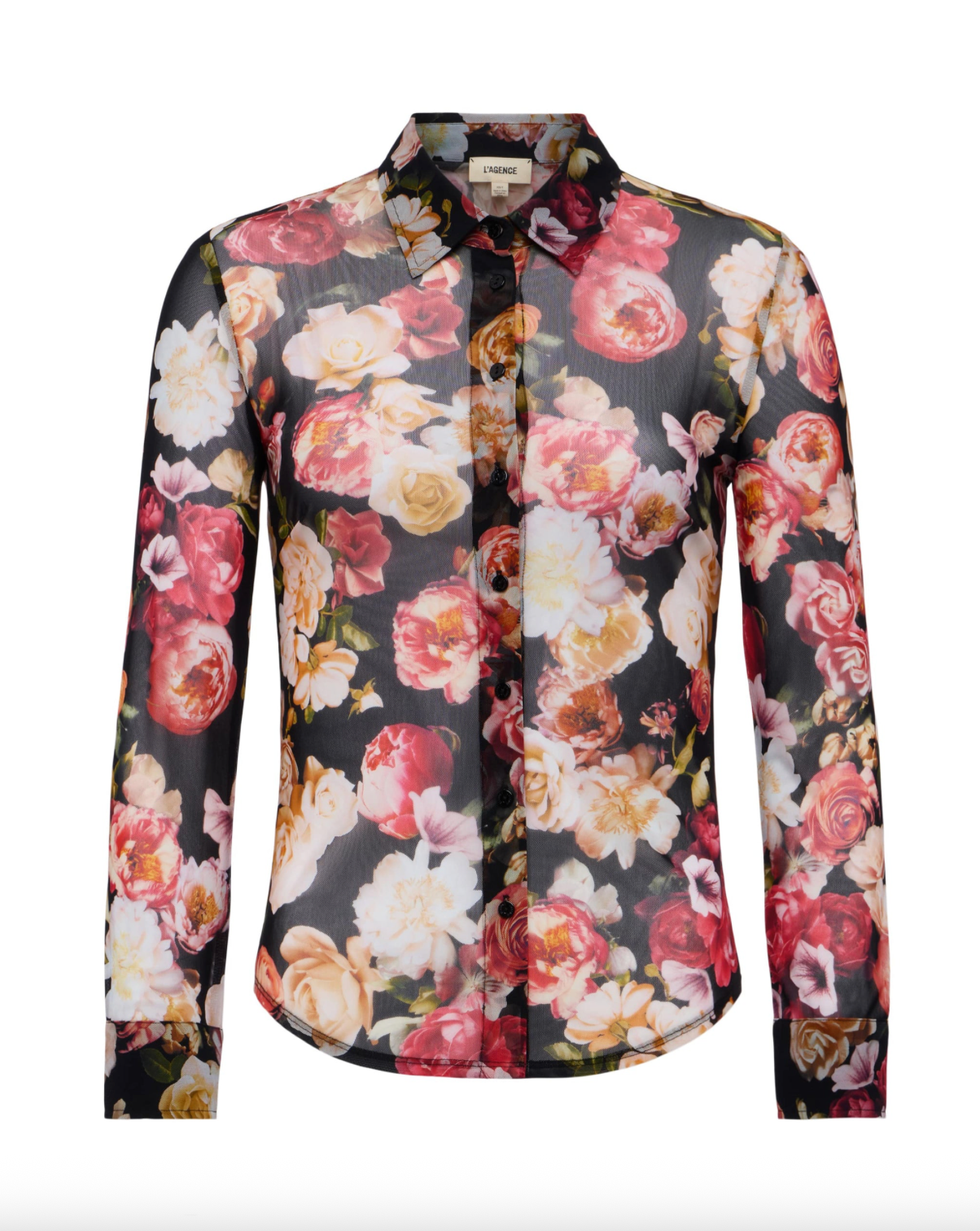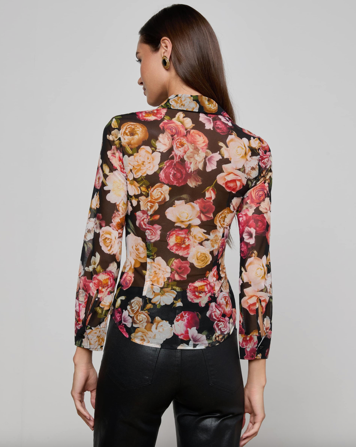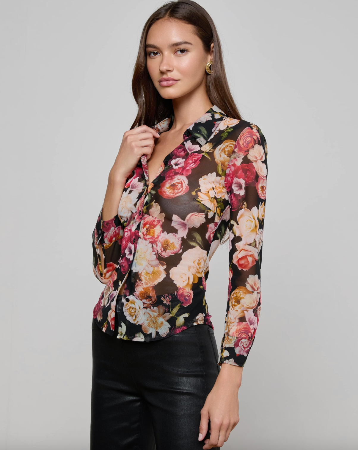 A modern twist on a classic button-up, crafted in sheer stretch mesh for a sleek, figure-hugging fit. With ¾ length sleeves and a fitted silhouette, this piece layers effortlessly over bralettes or camisoles for a subtly sexy, contemporary look.
