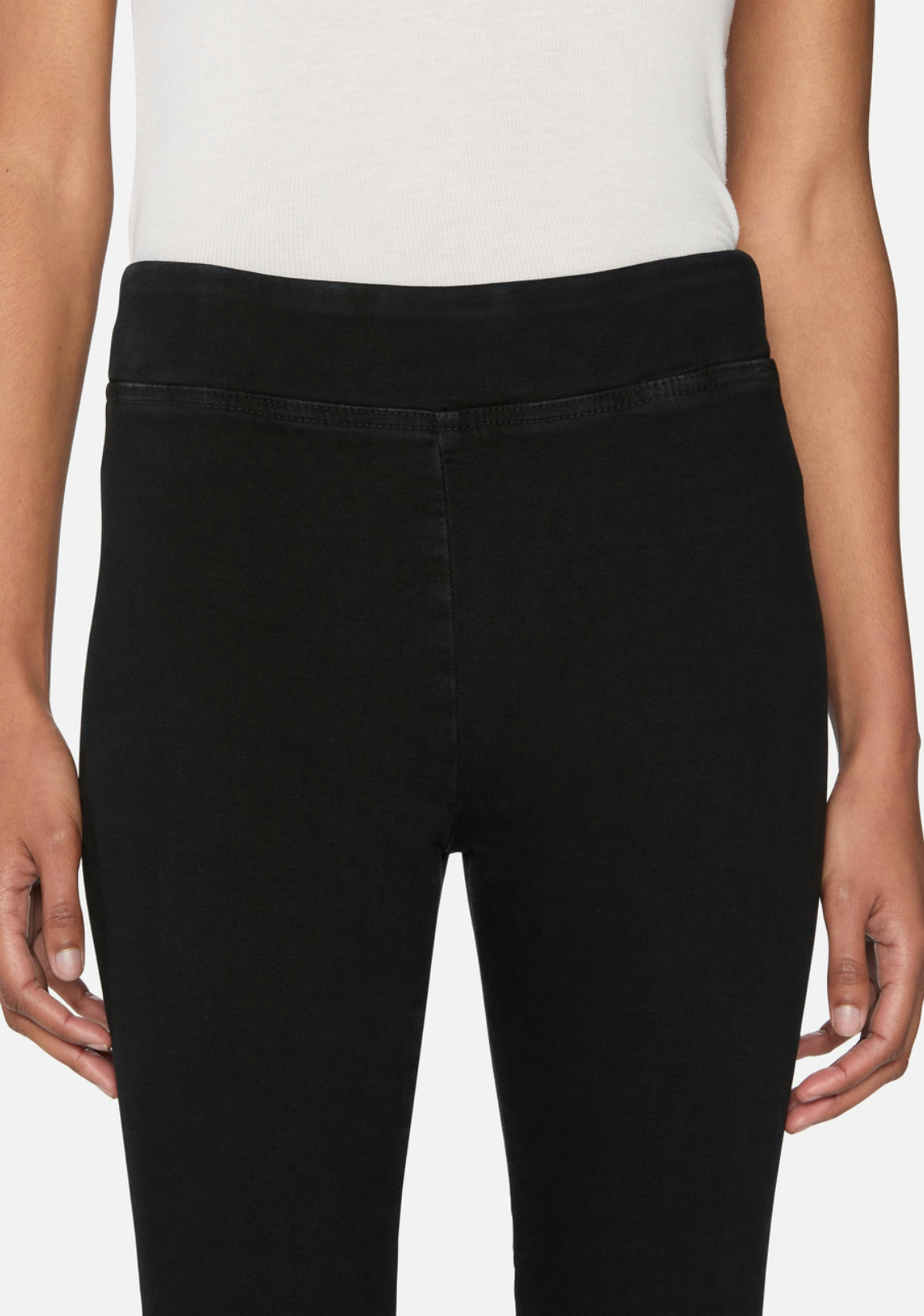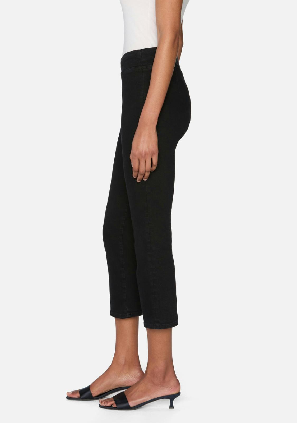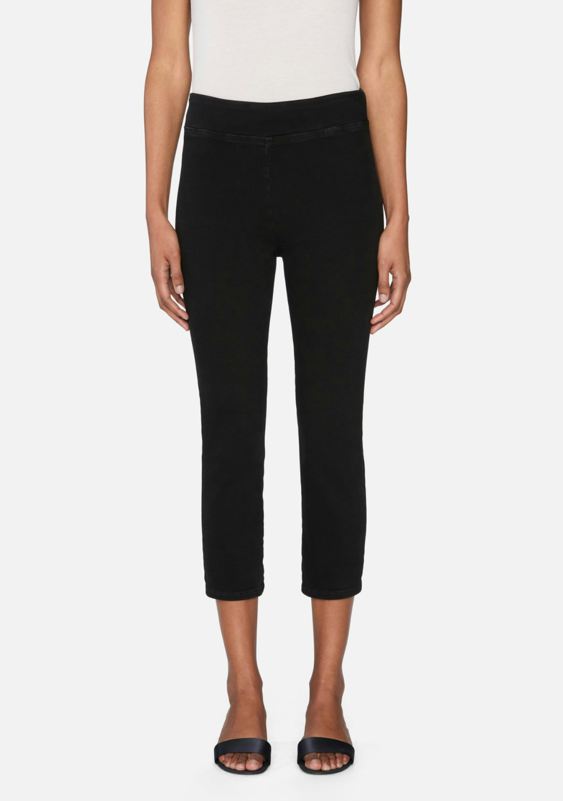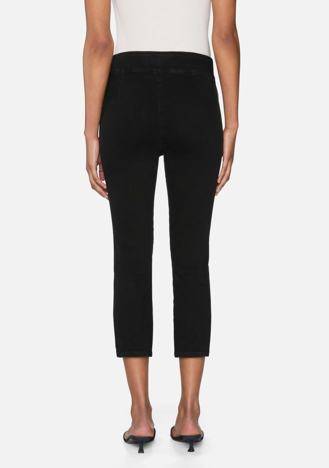 Designed for movement and modern style, this black capri offers a sleek, uninterrupted fit thanks to its pocket- and hardware-free construction. Crafted from ultra-stretch denim, it adapts to your body while maintaining its shape, making it the ideal piece for travel, errands, or even dressed-up workdays. The knee-length cut hits at just the right point to flatter the leg and pairs effortlessly with casual flats or refined heels.