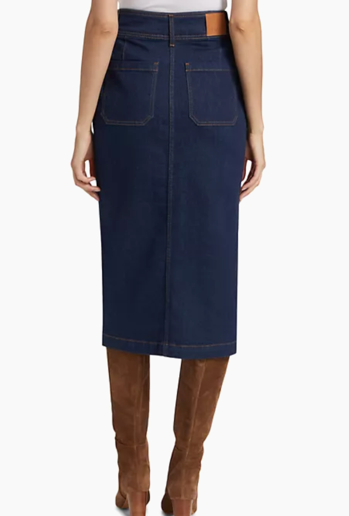 A dark wash denim, the Jewel midi-skirt from Derek Lam is styled with belt loops, side button-through flap pockets, and button-front closure.