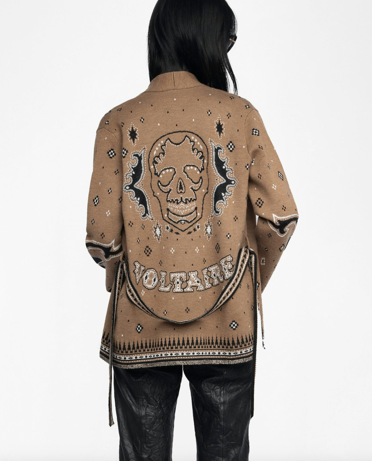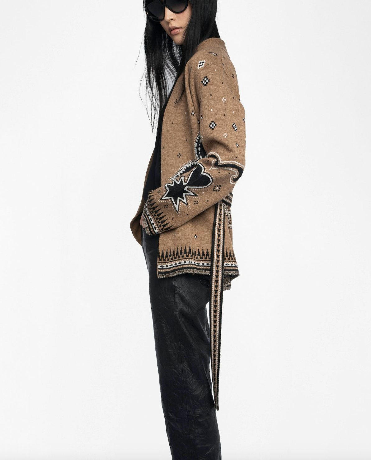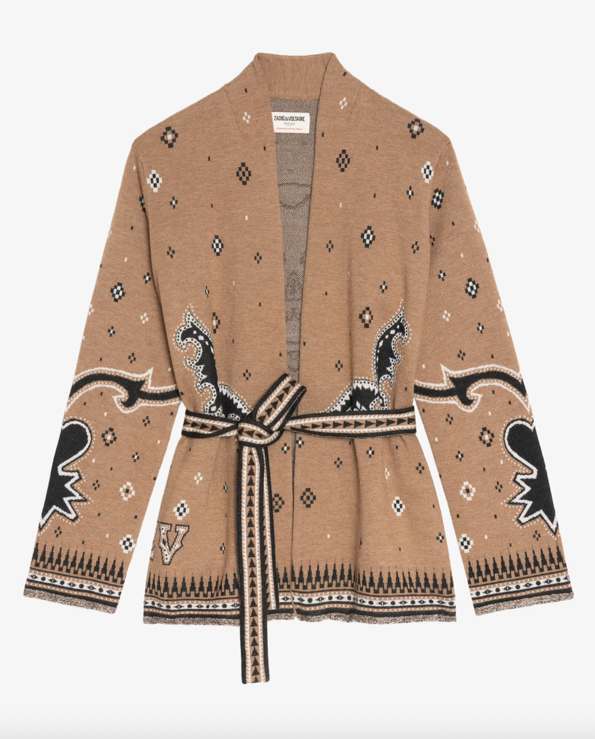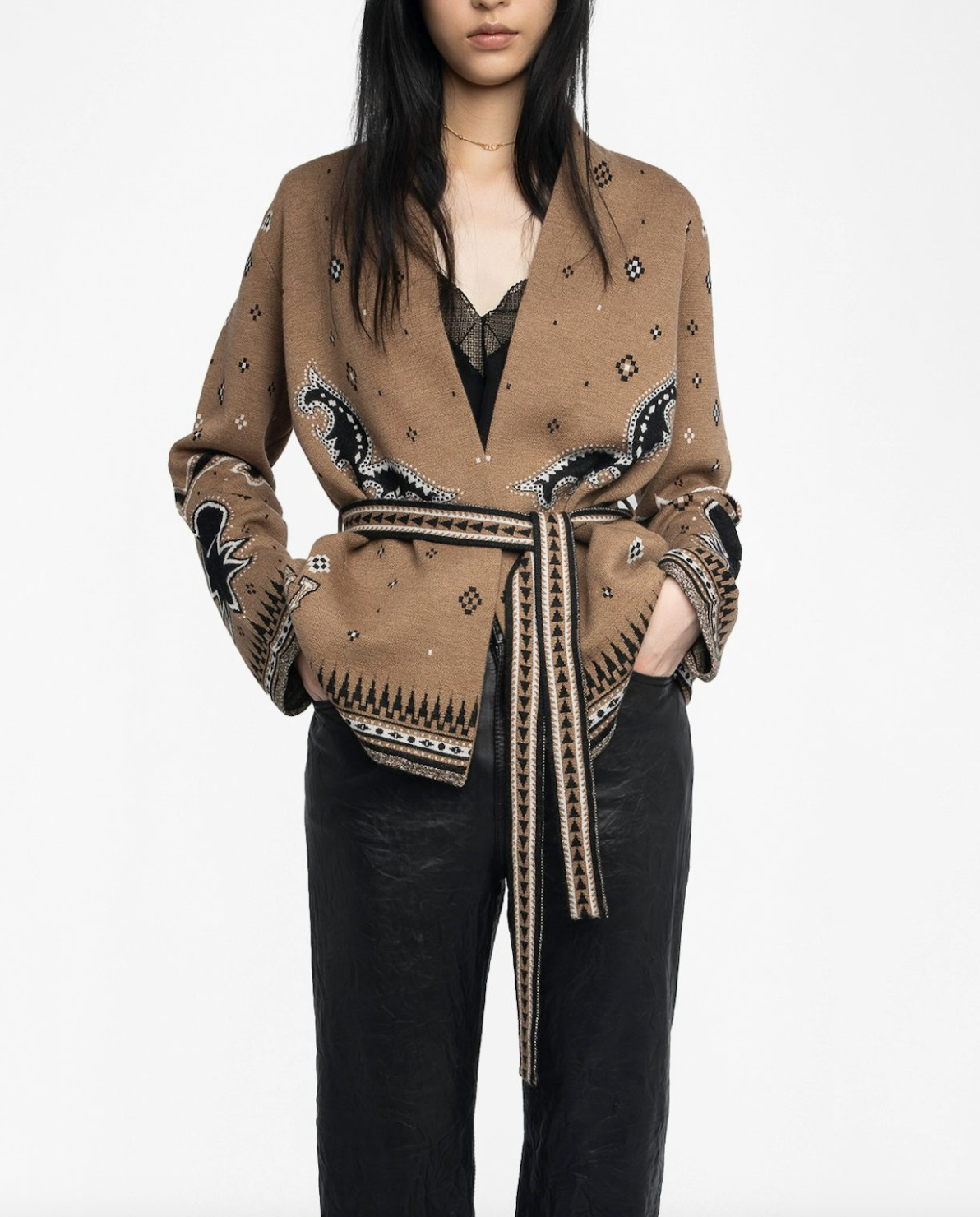 This 100% merino wool cardigan blends laid-back ease with refined detail. Featuring a modern jacquard pattern, fringe-trimmed hem and cuffs, and a wrap closure with belt, it delivers effortless elegance with a subtle edge. Perfect for layering when you want an undone look—on purpose.