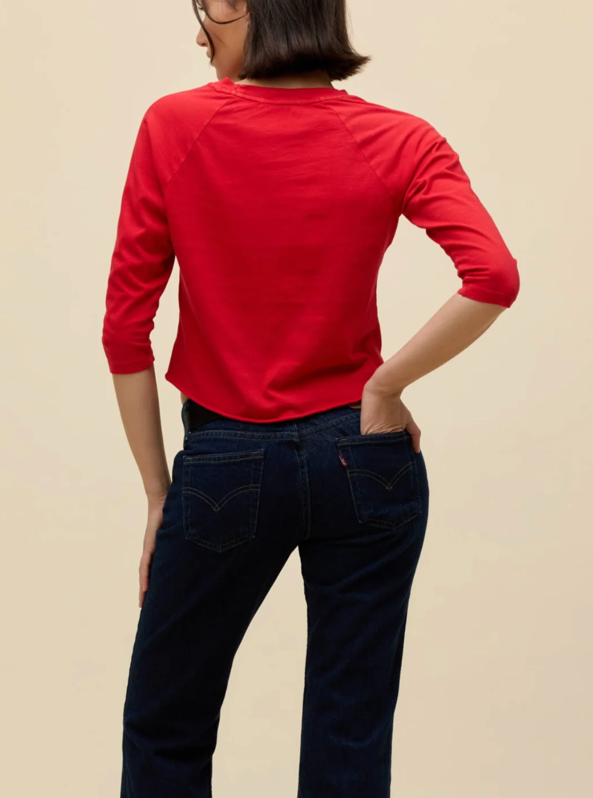 Designed with effortless cool in mind, this Raglan Tee blends vintage-inspired graphics with modern proportions. The slightly shrunken silhouette and raw hems give it that perfectly worn-in look, while the midweight cotton feels soft yet substantial for year-round wear. Style it tucked into high-rise denim with loafers for a laid-back city look, or pair with a mini skirt and sneakers for an easy, off-duty outfit with personality.