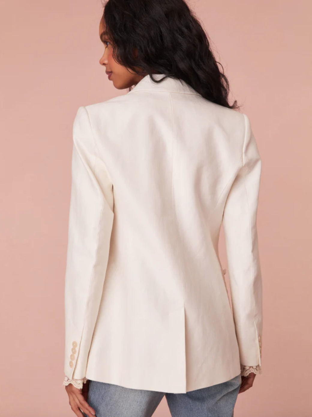 The Lamia Jacket, part of our slub suiting group, is crafted from a light linen blend fabric, making it perfect for transitioning into spring. This impeccably tailored jacket features a slightly oversized fit, a longer silhouette, a single button closure, and two hip pockets. For a complete suiting look, pair it with the Poppet Pants and make a stylish statement.