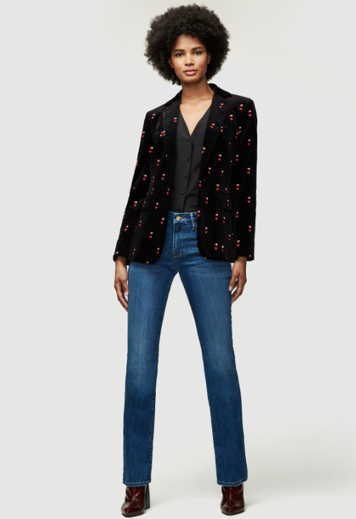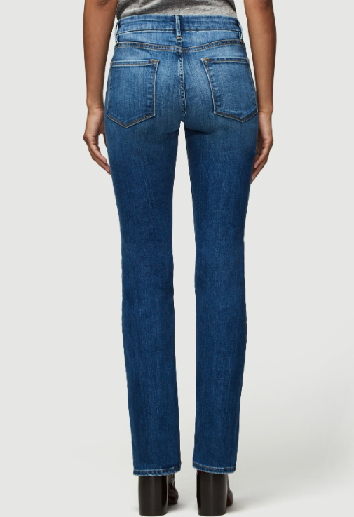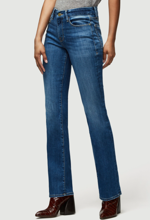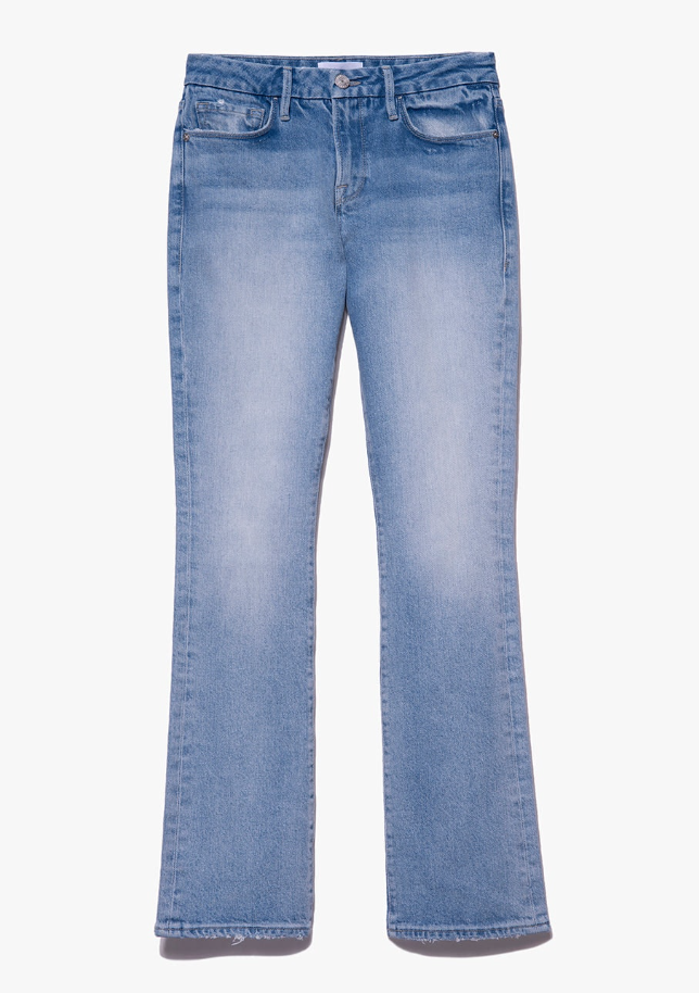 Mid-rise, boot-cut fit features a contour waistband for comfort and a close fit through the seat and thighs. Le Mini Boot's kick flare starts at the knee and finishes with a clean full-length hem. Toldeo is a medium-blue wash cut from premium super stretch denim, and features subtle fading at the hip crease and thighs.