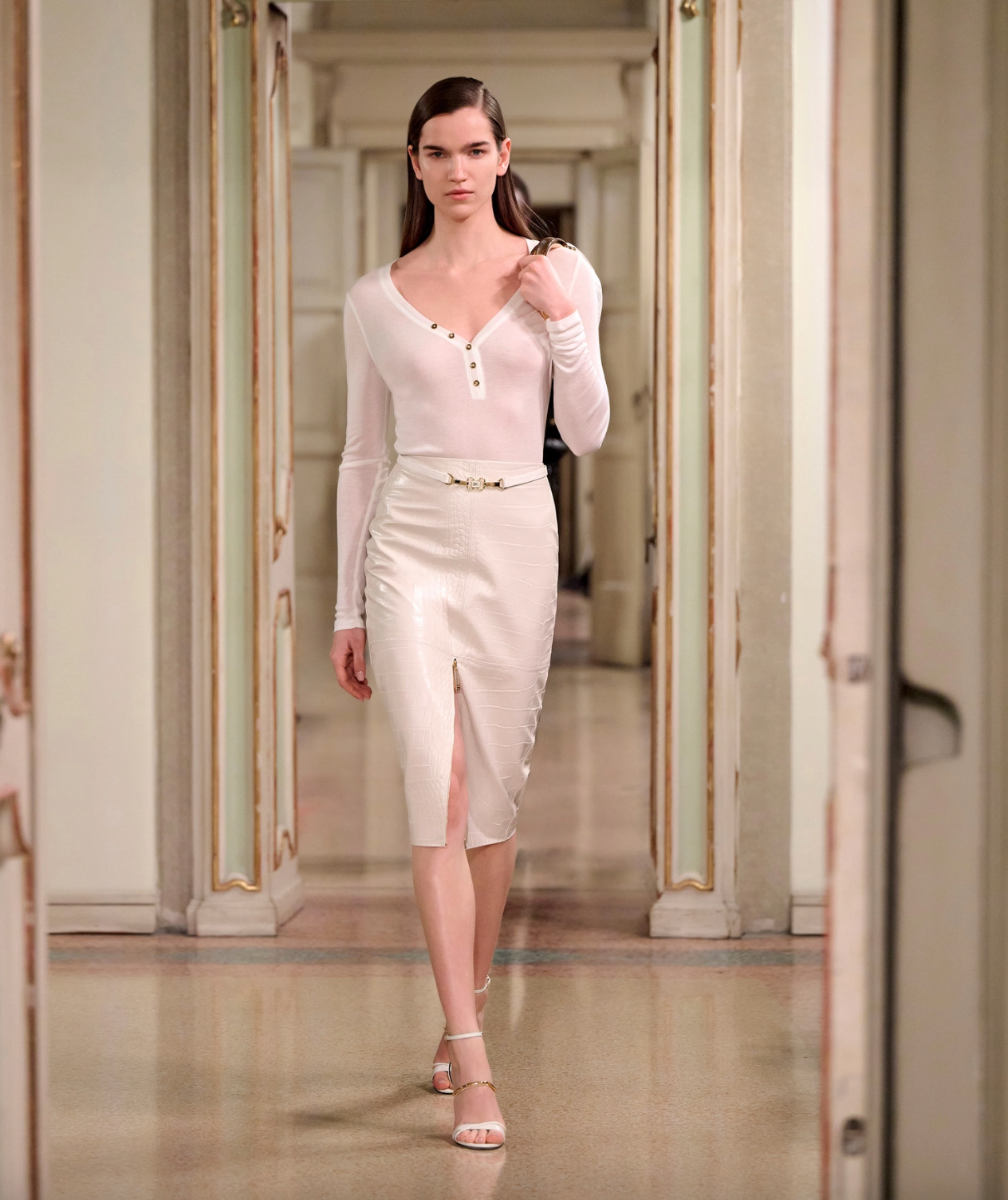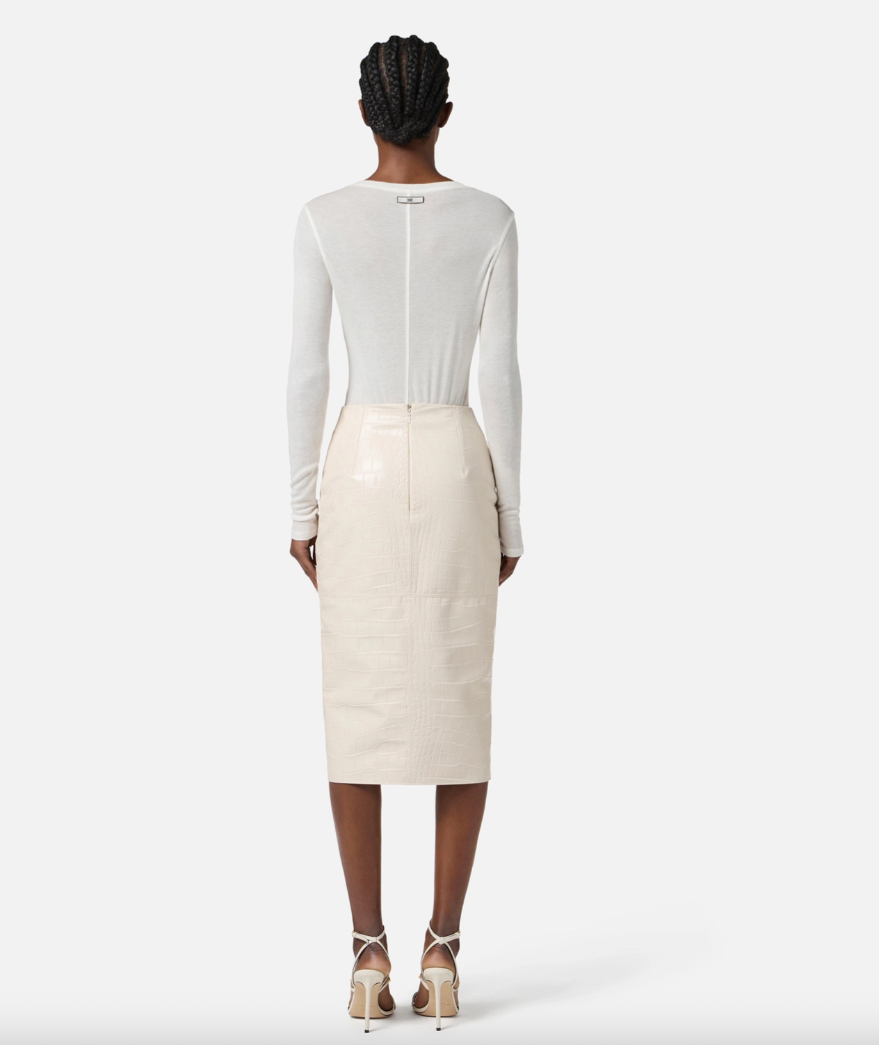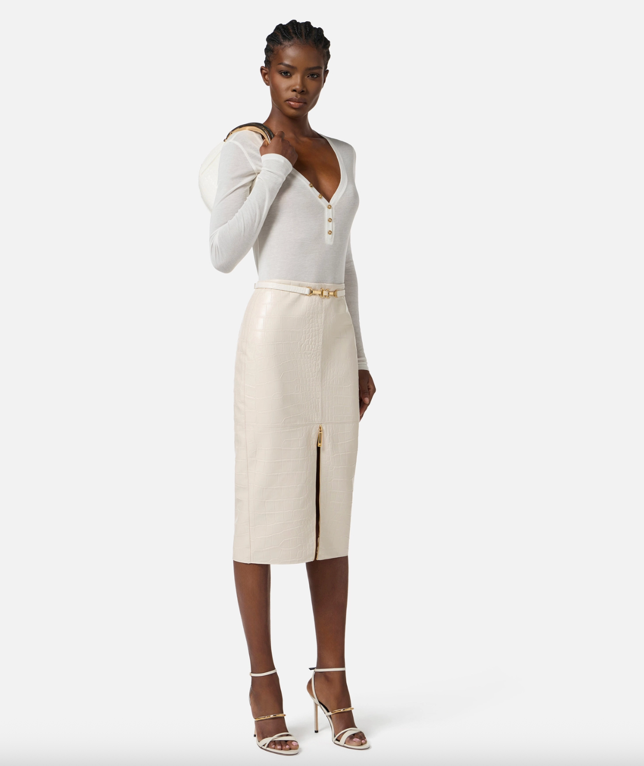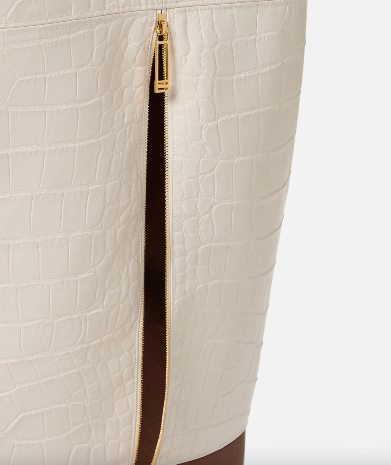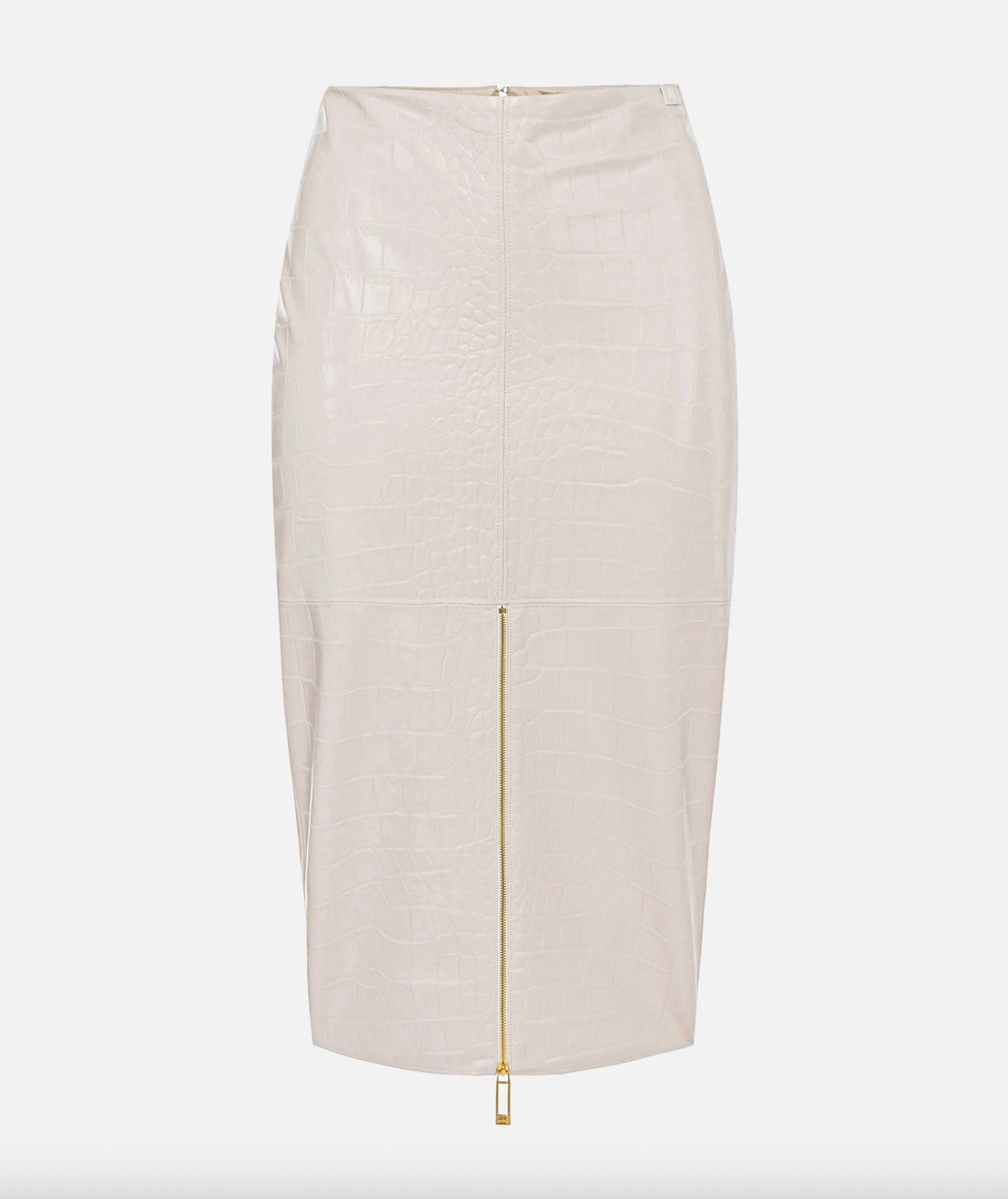 A sleek pencil silhouette meets modern edge in this leather-effect skirt. Crafted from crocodile-textured synthetic material, it’s designed for a slim, flattering fit that highlights the figure. The golden front zip adds a touch of shine while revealing a subtle slit for effortless movement and allure.