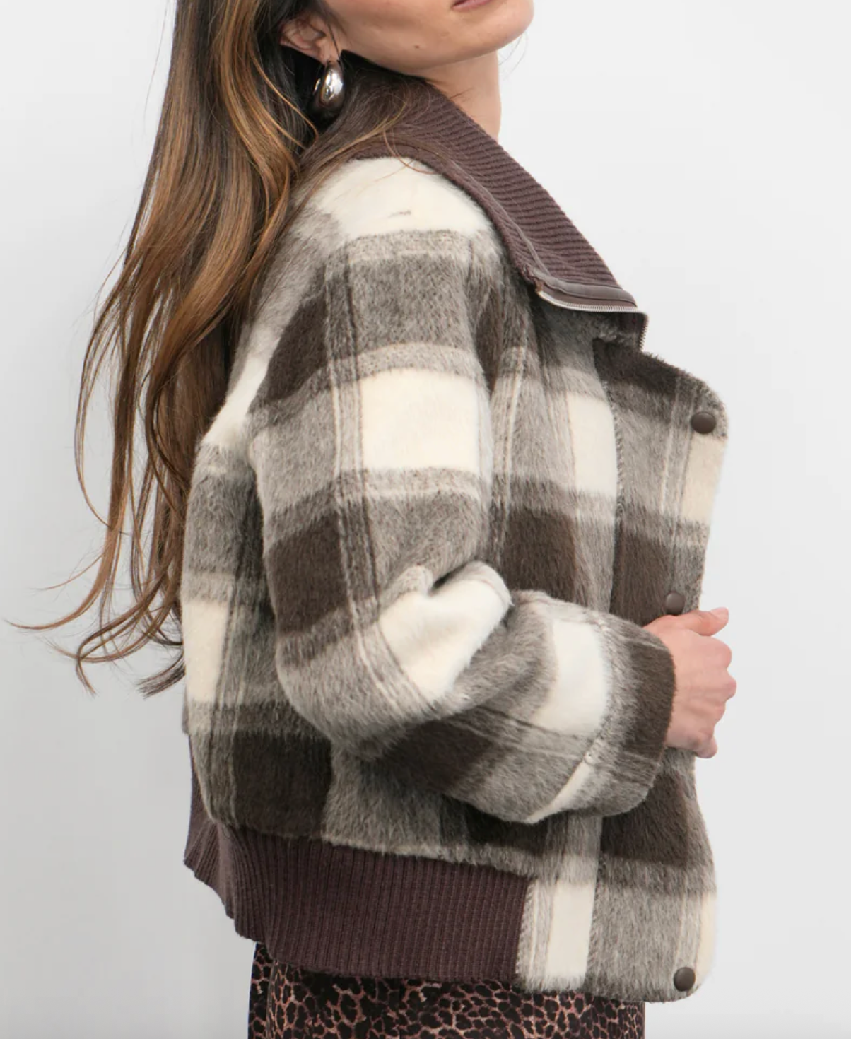 A modern update on a classic, this plaid jacket pairs timeless brown and tan hues with contemporary design details. The relaxed, boxy silhouette is complemented by a large, oversized knit collar in a contrasting color, adding warmth, softness, and a subtle statement. Perfect for layering over casual or polished outfits alike.