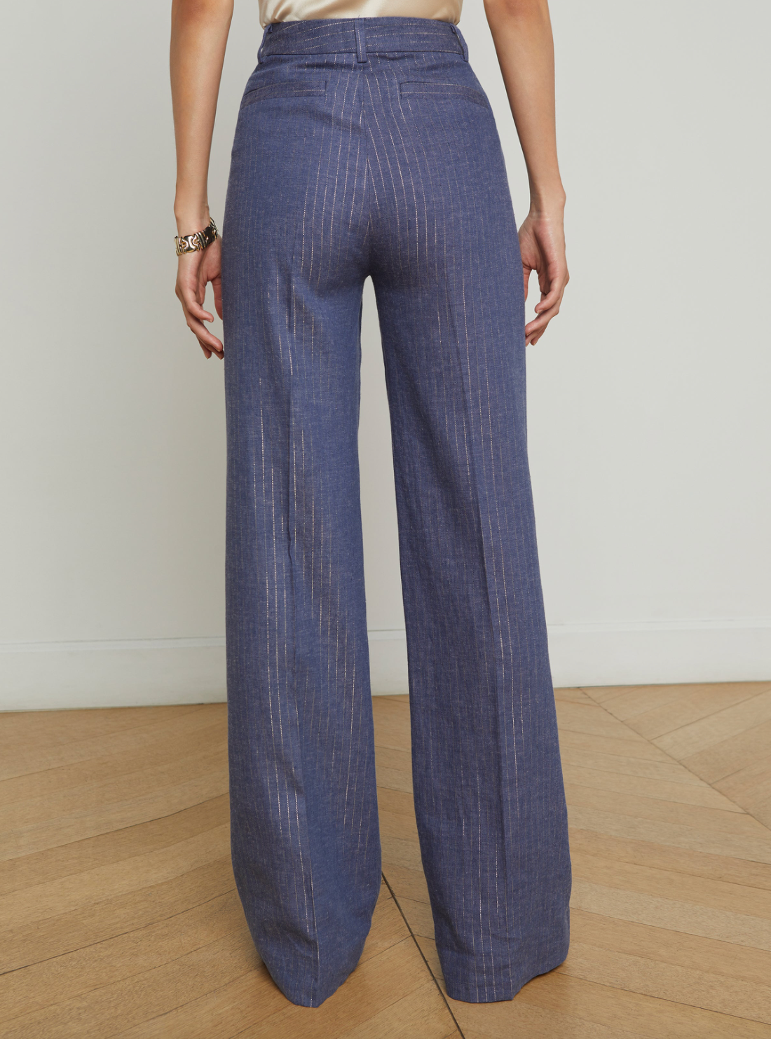 The L’AGENCE Favorite Trouser gets a fresh update in a sleek metallic pinstripe, combining timeless sophistication with a modern edge. Fitted through the hips and relaxed through the leg, these trousers offer a flattering silhouette that’s both chic and comfortable. The linen-cotton blend fabric ensures breathability and ease, while the high-rise wide straight-leg design creates a polished look. With side and back welt pockets, plus a hidden hook-and-bar closure, these trousers are as functional as they are stylish. Pair them with a tucked-in blouse for work or a sleek tank for an elevated evening look.