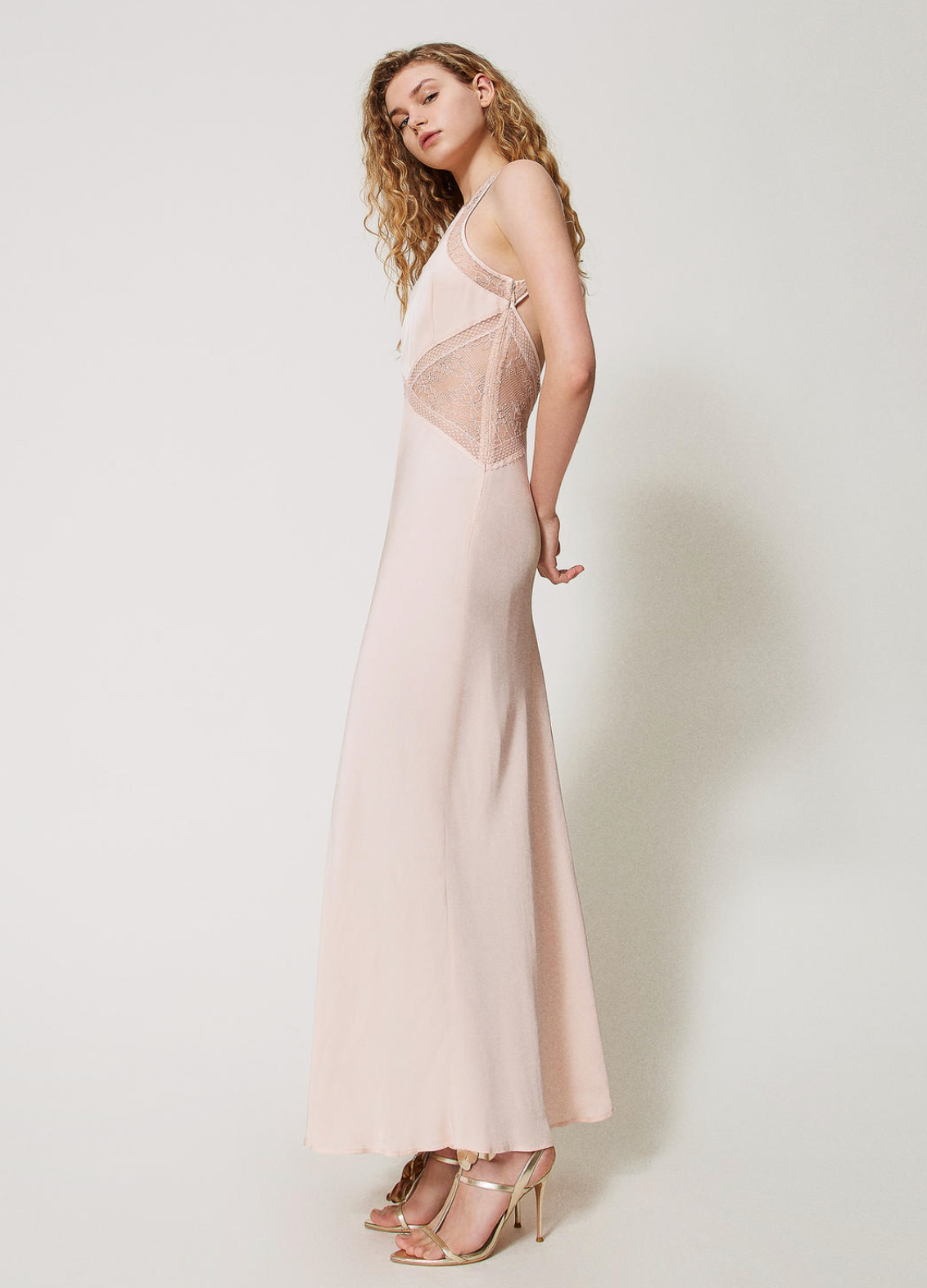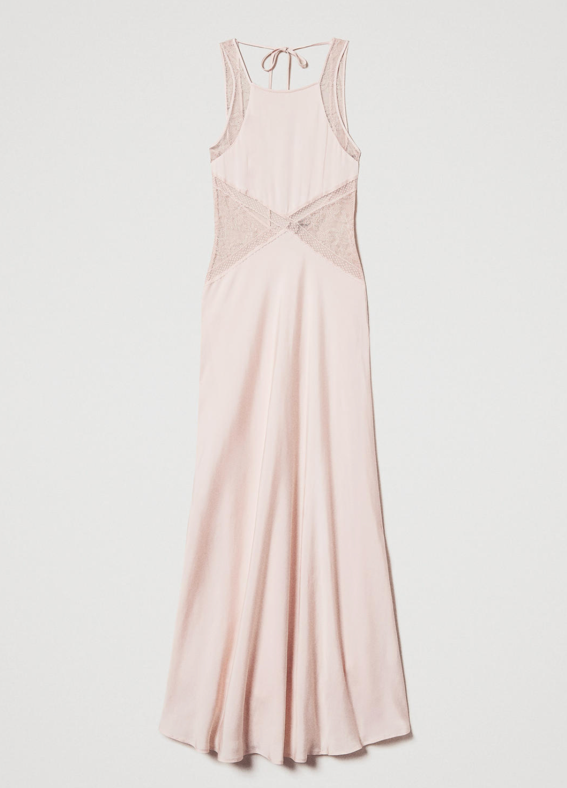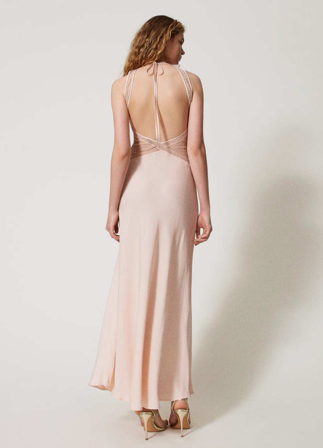 This stunning halter neck dress combines refined elegance with modern allure. Crafted from matte viscose satin and adorned with delicate Valenciennes lace inserts, it’s designed to turn heads at any party or formal occasion. The criss-cross lace trim motif on the front and the bias-cut skirt create a graceful, flattering shape, while the tie fastening at the neck ensures a customizable fit. With its fitted shape and unlined design, this dress is perfect for a chic night out or a sophisticated event. Style it with sleek heels and statement accessories for a show-stopping look.