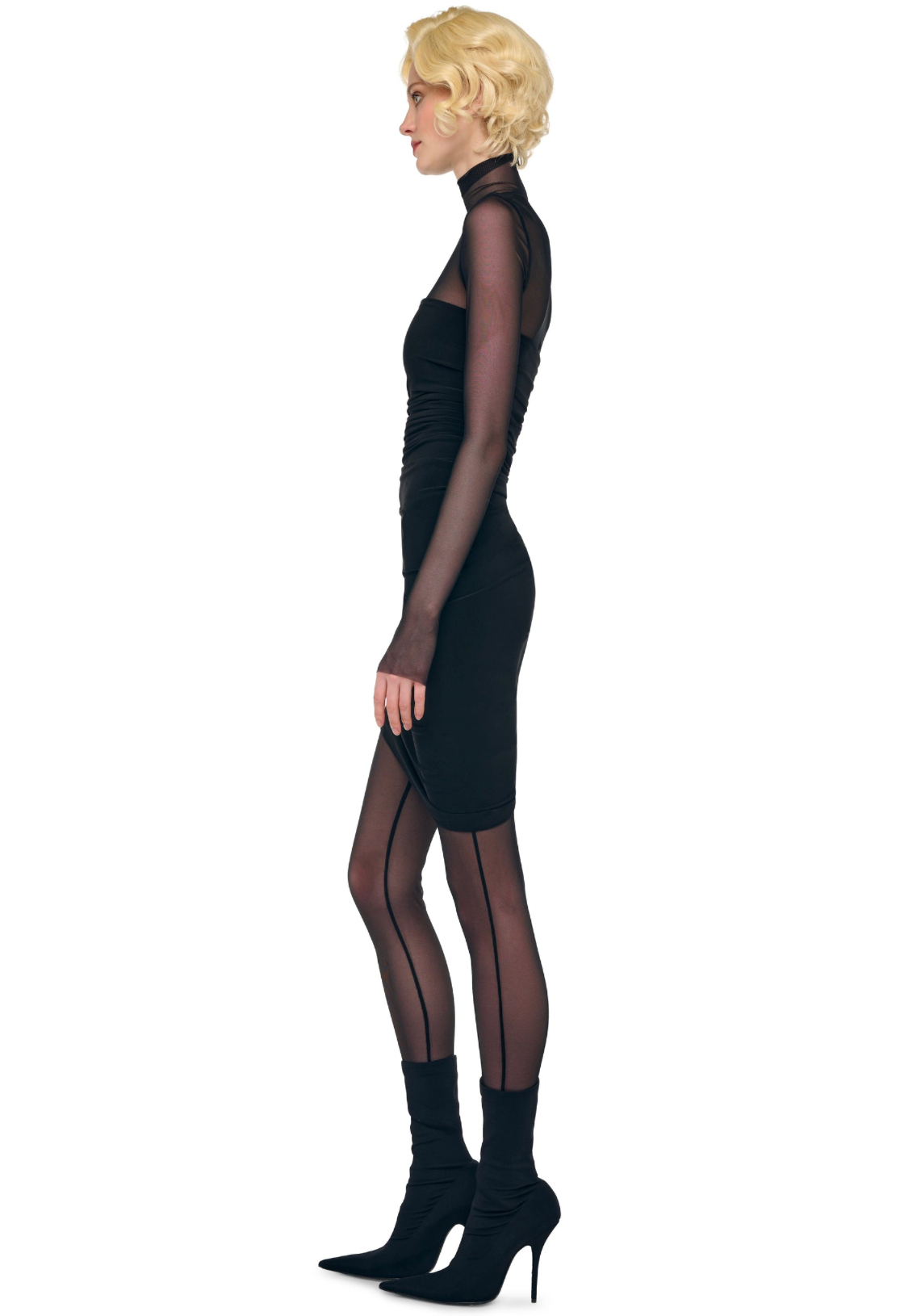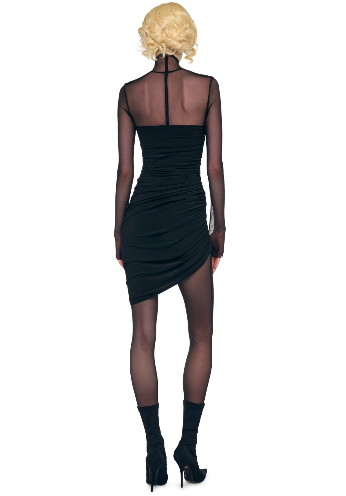 This hybrid piece blends the drama of a strapless Diana dress with the edge of a sheer catsuit, finished with thoughtful ruching and stretch for a sculpted, show-stopping look.