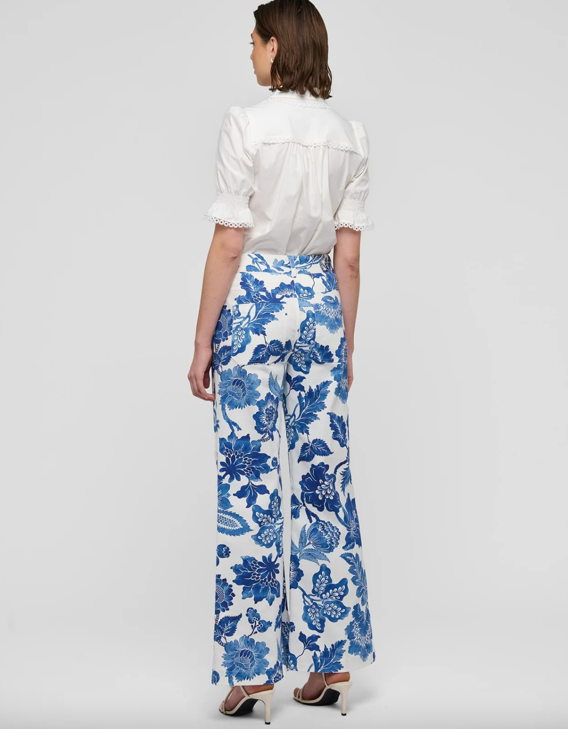 Modern, feminine, and bold—these high-waist trousers fit close at the hips before flaring gracefully to the hem. Crafted in stretch cotton twill with a striking large blue floral print, they feature western-style front and back pockets for urban attitude.