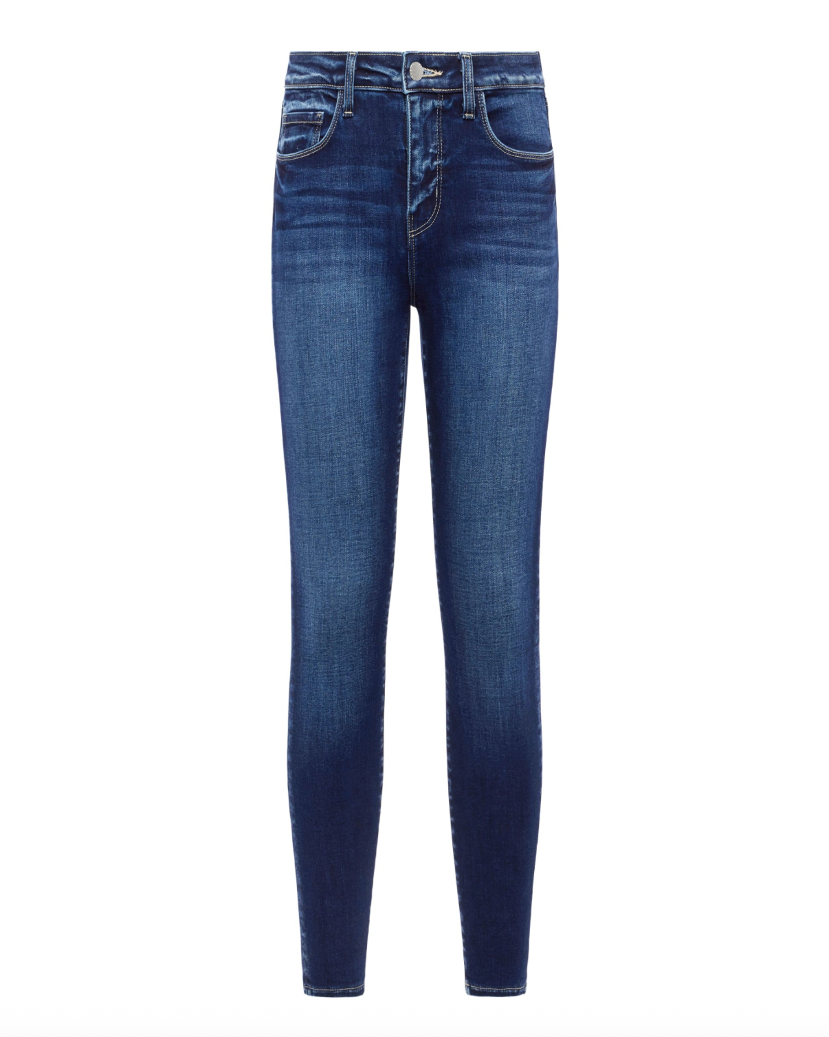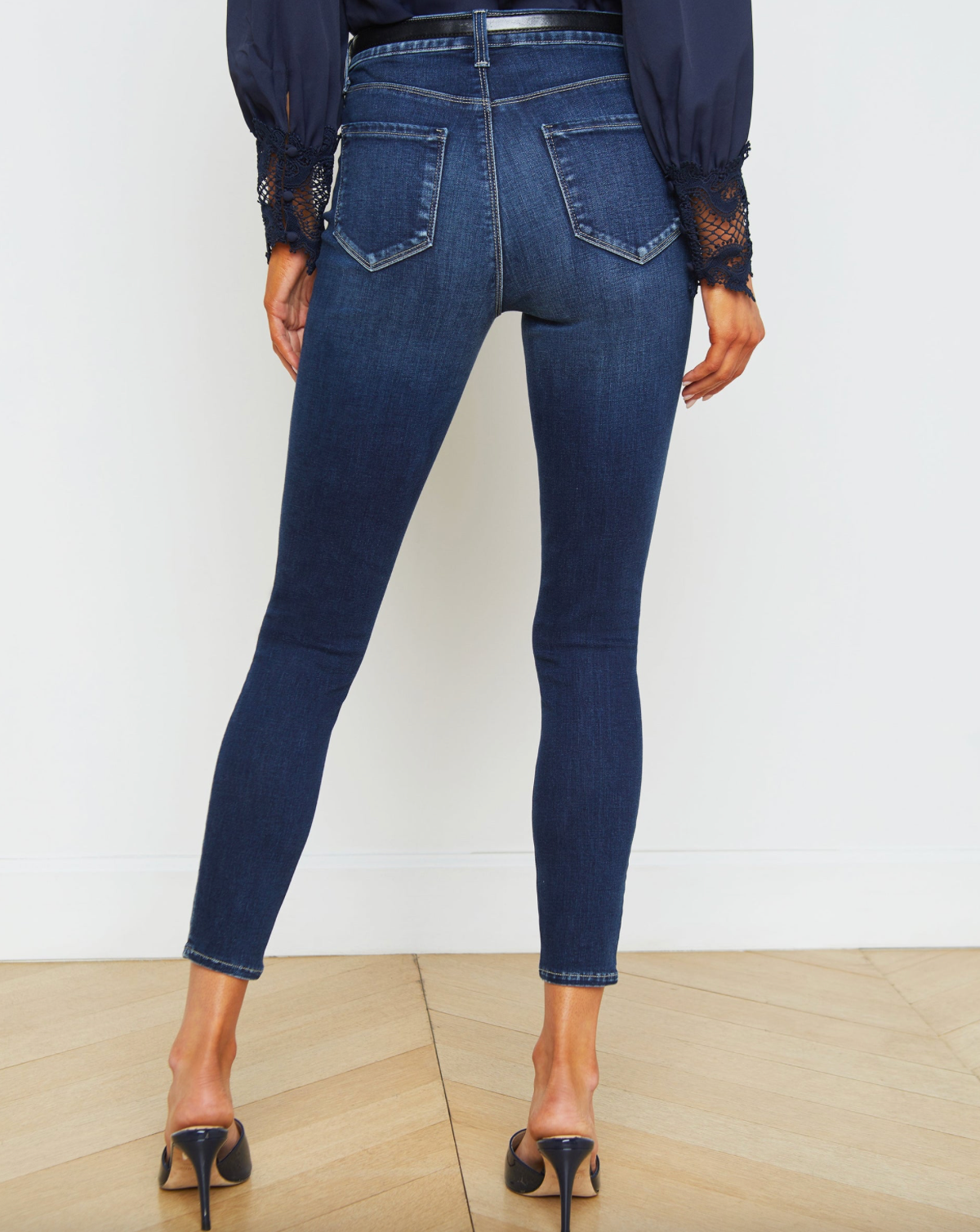 High-rise skinny jean crafted from premium, luxurious stretch denim in rich indigo. Tapered leg hugs from hip to ankle, while the contoured waistband defines and slims the natural waist. High-recovery fabric holds its shape, smoothing the silhouette without sacrificing comfort.