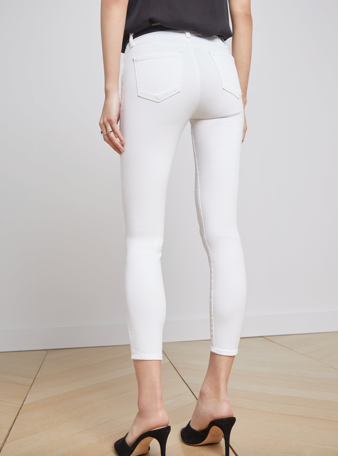 High-rise skinny jean crafted from premium, luxurious stretch denim in rich indigo. Tapered leg hugs from hip to ankle, while the contoured waistband defines and slims the natural waist. High-recovery fabric holds its shape, smoothing the silhouette without sacrificing comfort.