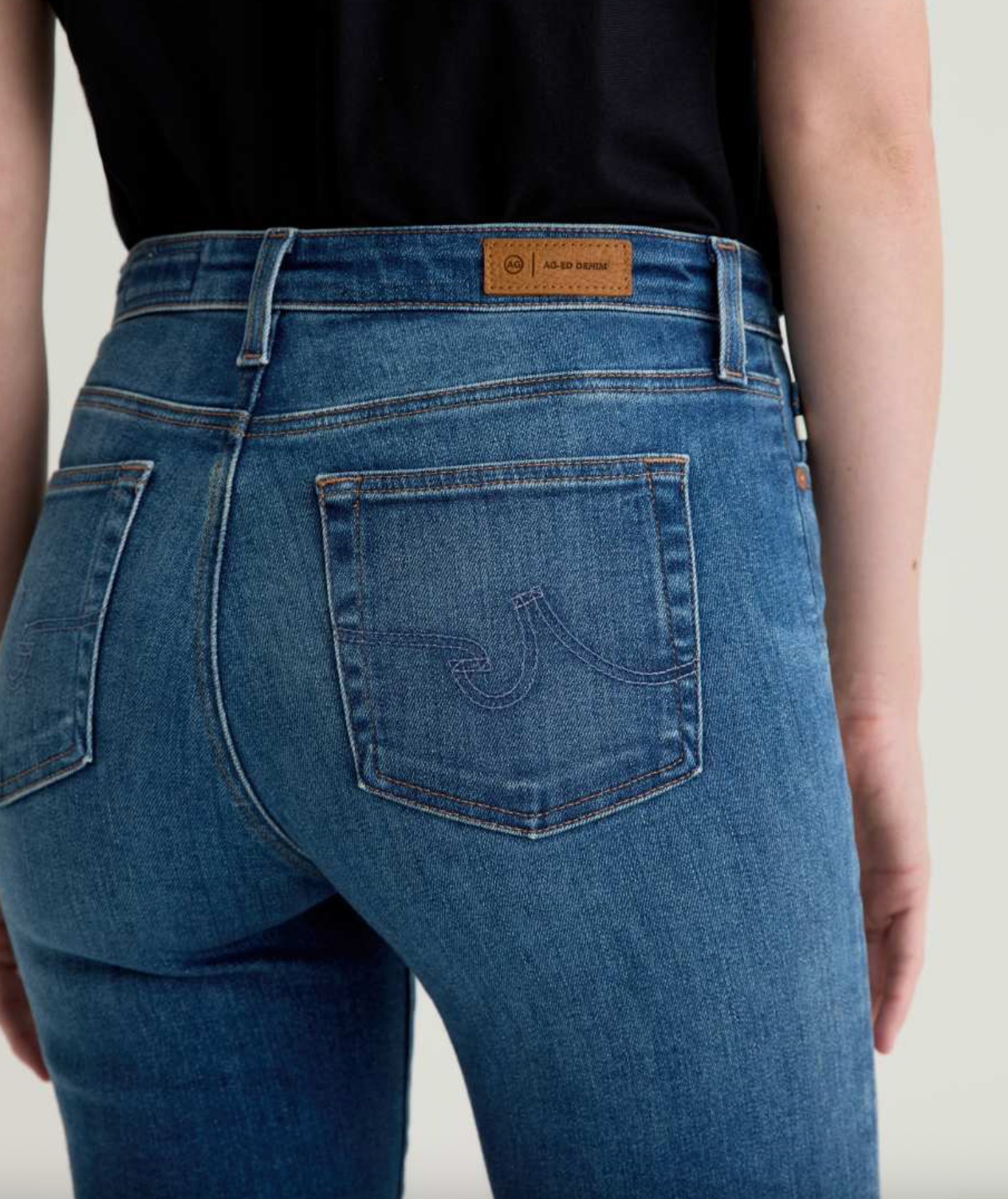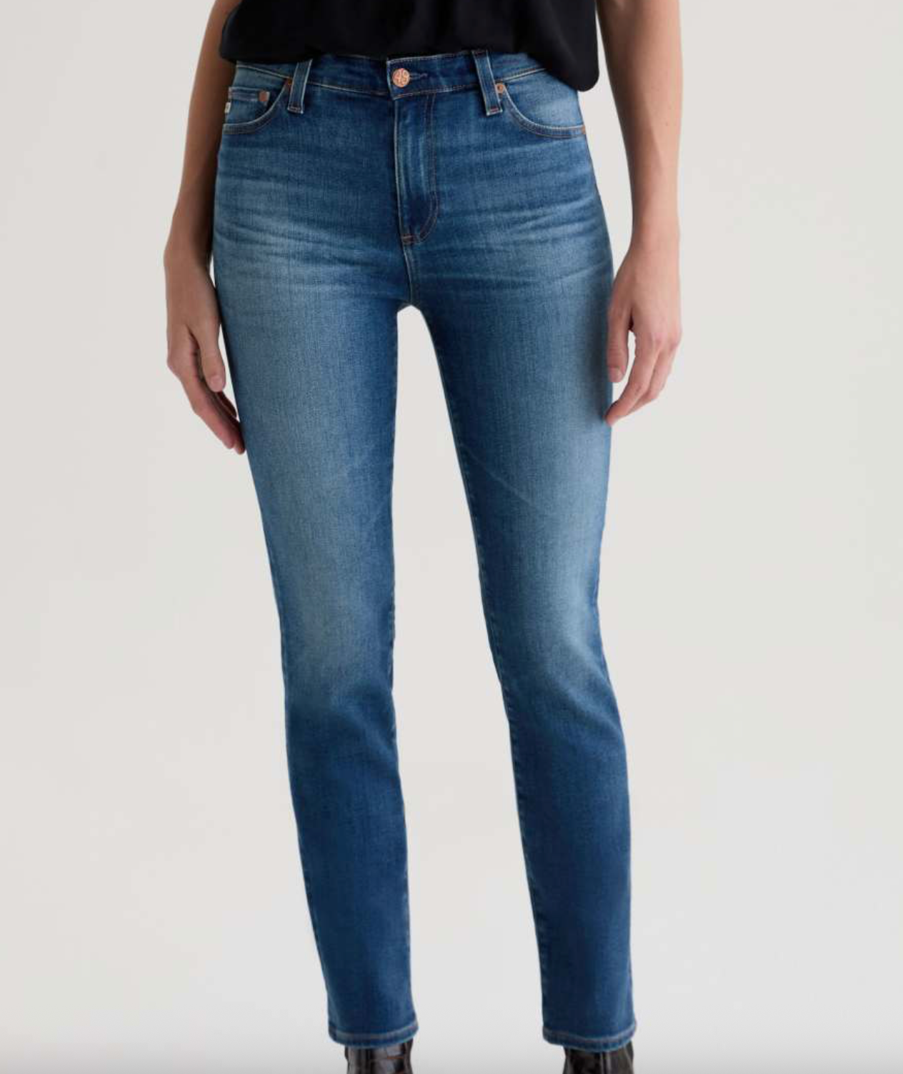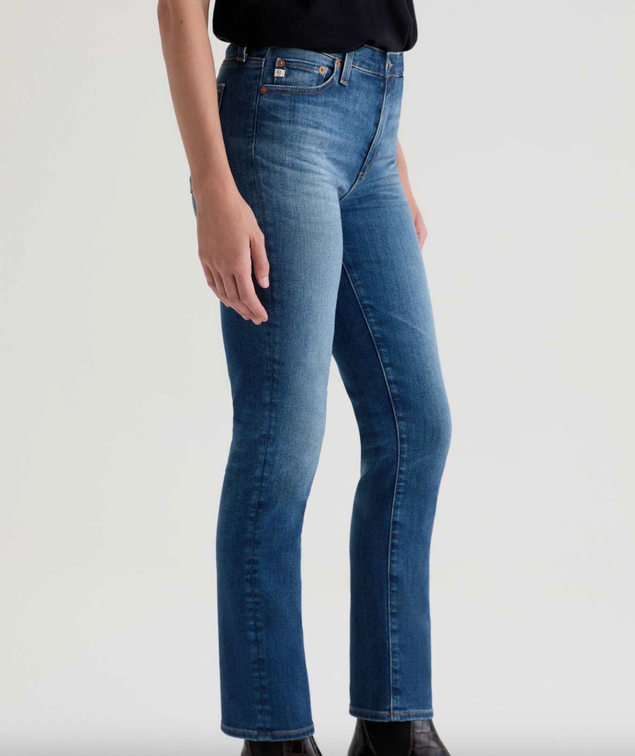 The Mari High Rise Straight Leg Jean for women featuring an authentic medium wash fits around the hips, complete with a straight leg and subtle slim leg opening.